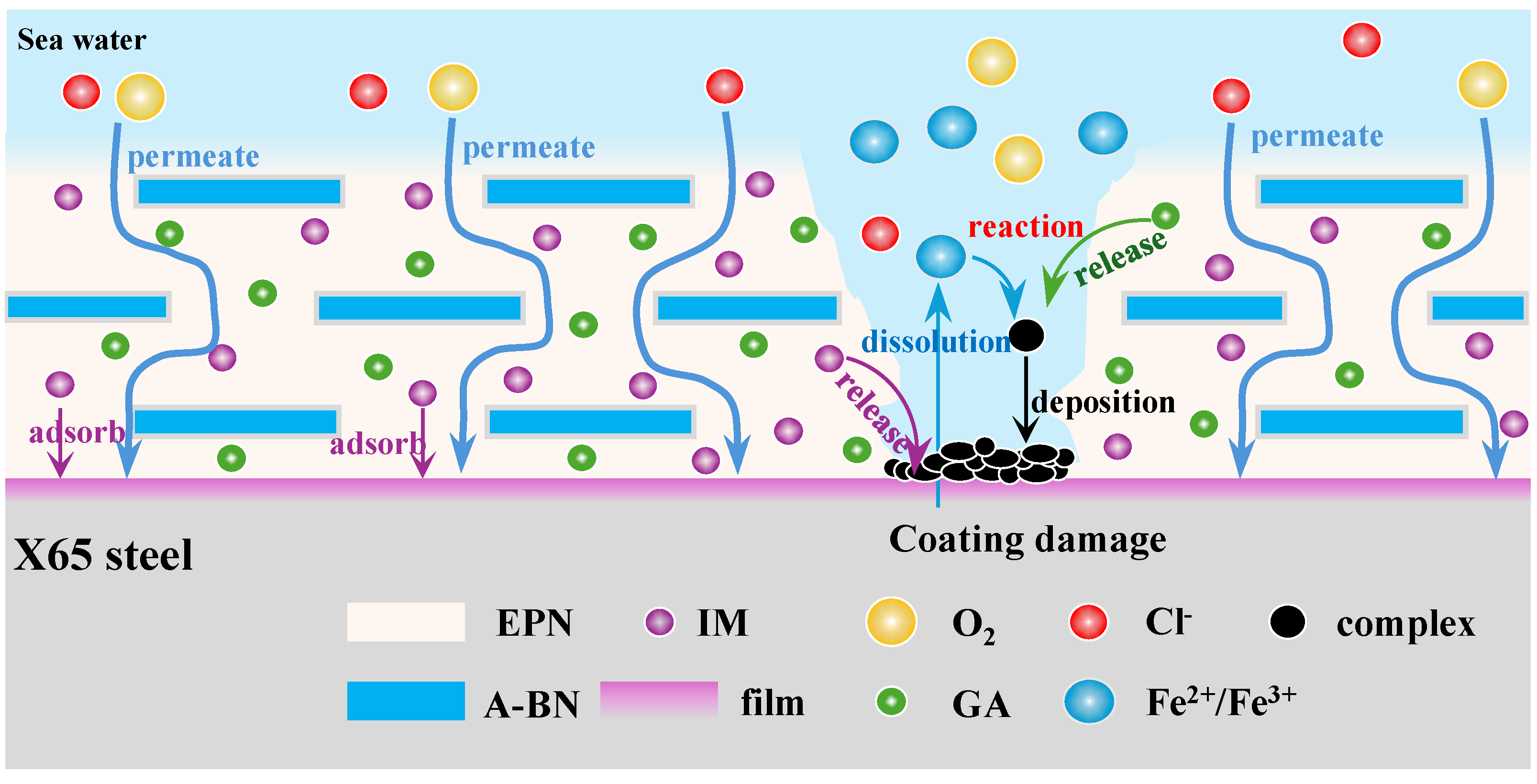 With prolonged service, coating degradation—manifested as reduced barrier performance or even physical damage—becomes inevitable. When the coating is mechanically damaged, the underlying metal becomes directly exposed to the corrosive environment, substantially increasing the risk of localized corrosion. Under such conditions, the spatial barrier effect of A-BN becomes ineffective at the defect site due to the absence of a continuous coating matrix. However, IM and GA molecules from the intact coating regions adjacent to the damaged area migrate toward the exposed metal surface driven by concentration gradients. IM molecules adsorb onto the active metal surface through amino-metal coordination, forming a protective molecular film that suppresses anodic dissolution. Simultaneously, GA molecules react with iron ions generated at inadequately protected areas, forming stable, insoluble chelate complexes that deposit on the metal surface, providing supplementary sacrificial protection. On the exposed substrate, IM and GA operate to establish a dual passive layer through “chemical adsorption–physical barrier” interactions, thereby achieving autonomous self-healing of the coating and effectively restoring corrosion protection at the damaged interface.