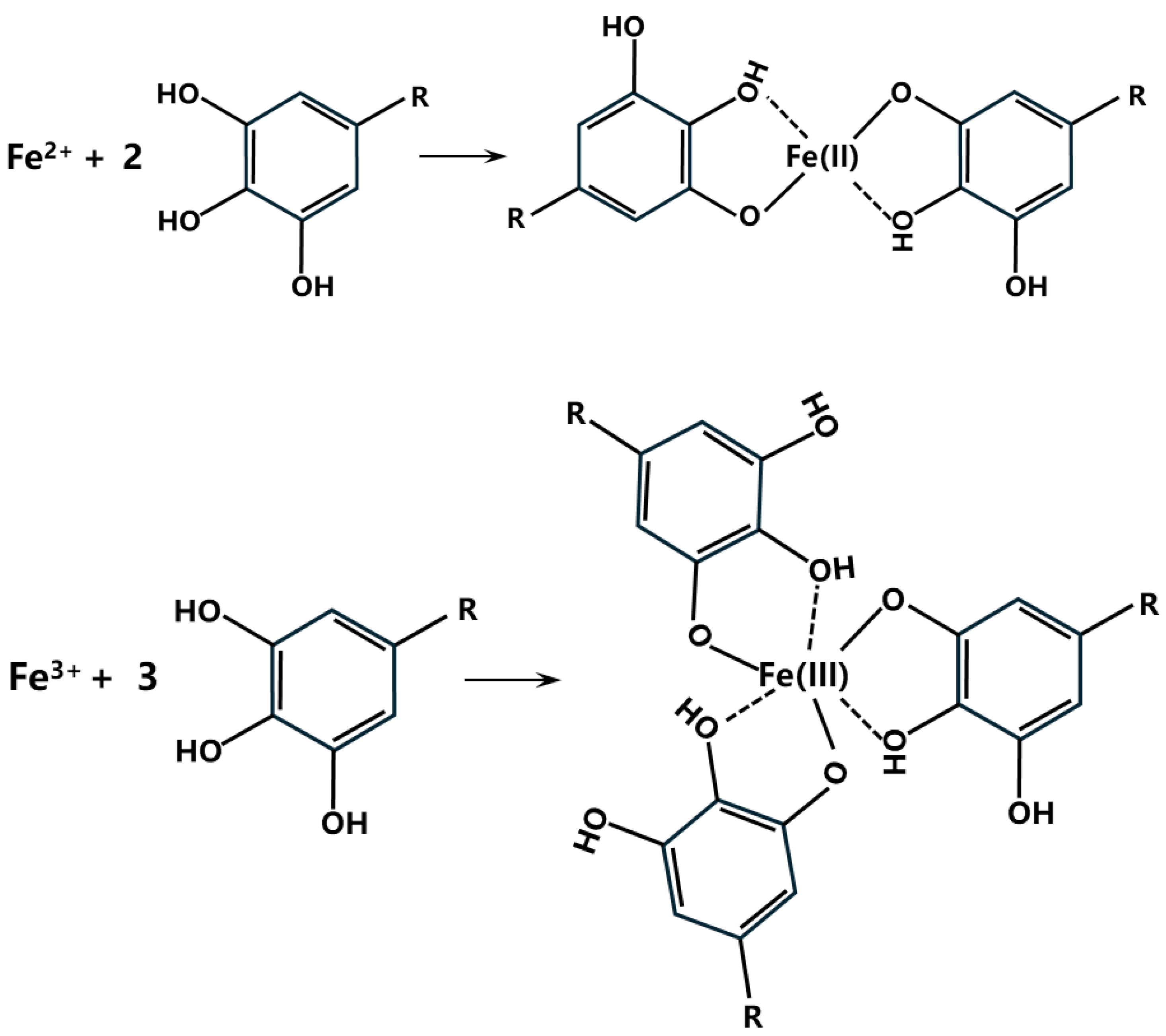 Figure 17. The chemical mechanism of chelation reactions between GA and Fe2+ and Fe3+ [29].
