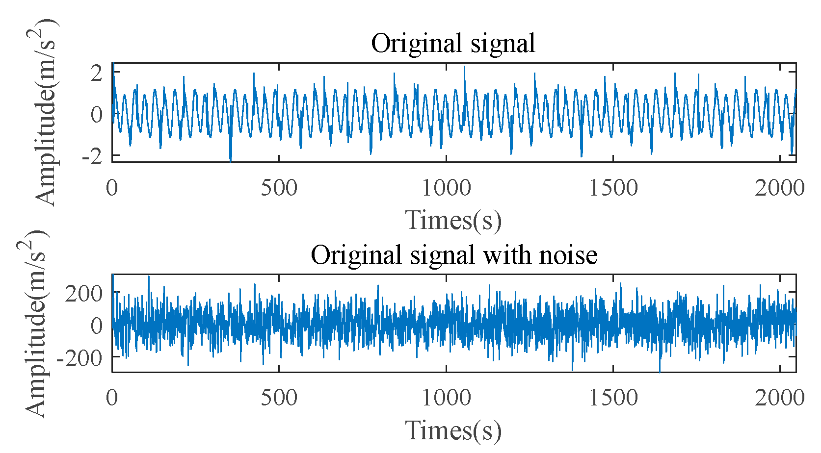 Figure 6: the time-domain waveform exhibits typical periodic impulse characteristics, while its frequency-domain energy distribution is dominated by a strong noise background, obscuring the fault characteristic frequency components. This significant noise interference makes it difficult to extract fault characteristic frequency components.