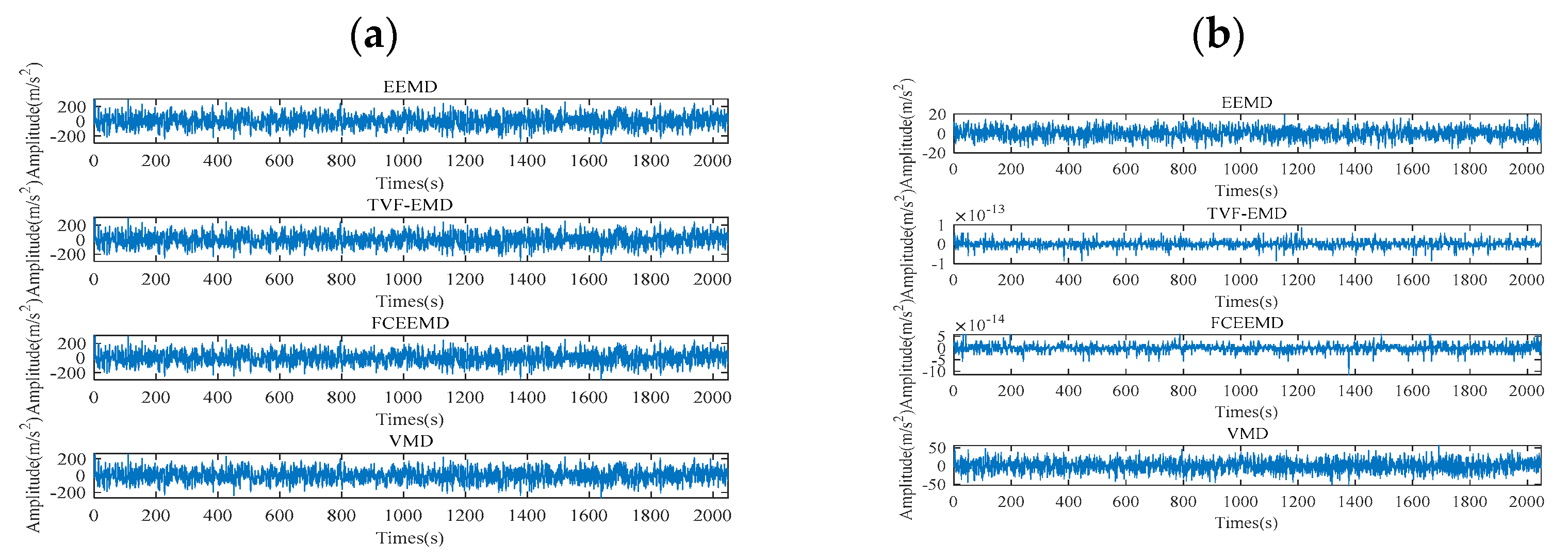 Figure 8, among the four decomposition methods, the reconstruction signals of FCEEMD and TVF-EMD contain more pronounced periodic pulse components. This indicates that TVF-EMD and FCEEMD can effectively extract fault characteristic frequency components. In addition, within the same frequency range, the amplitude of the reconstruction signal obtained by FCEEMD is relatively high. This indicates that FCEEMD more effectively preserves the main components of the signal. More importantly, compared to the original signal in