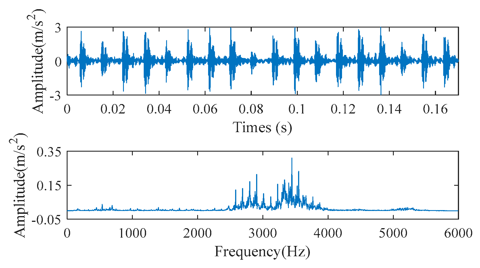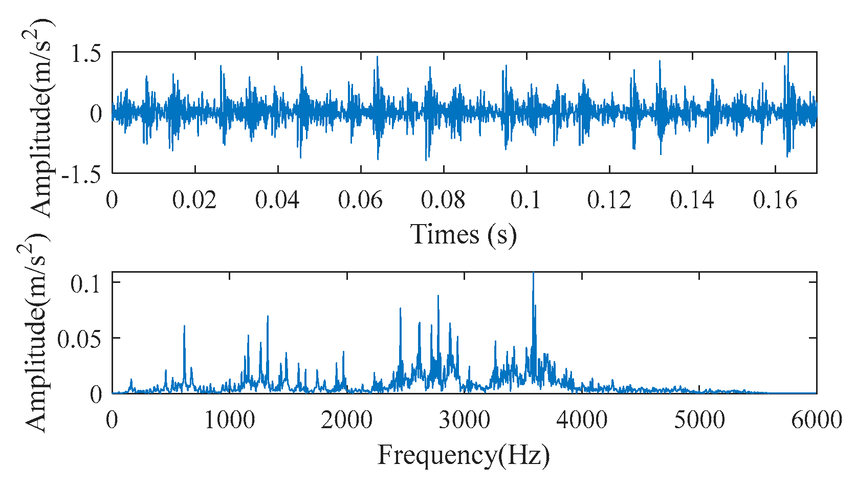 Figure 6. Analysis of the time-domain waveform indicates that the inner ring signal possesses a weakly periodic nature. In addition, the low-frequency and high-frequency frequency amplitudes in the frequency domain are relatively large and are subject to interference from many non-fault components. The frequency-domain analysis indicates that the characteristic frequency and harmonics of the inner ring fault signal are obscured by noise, making them difficult to distinguish.