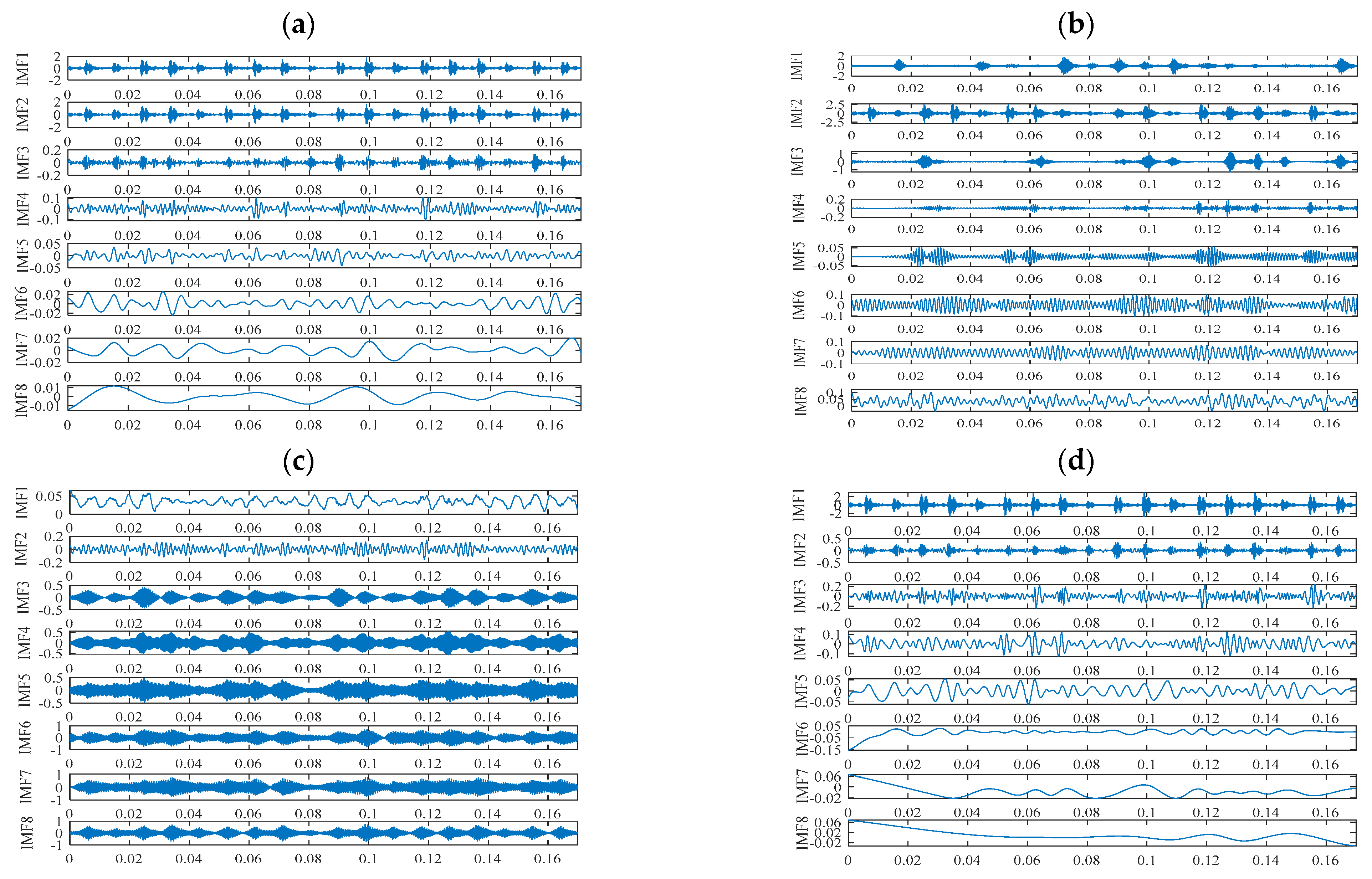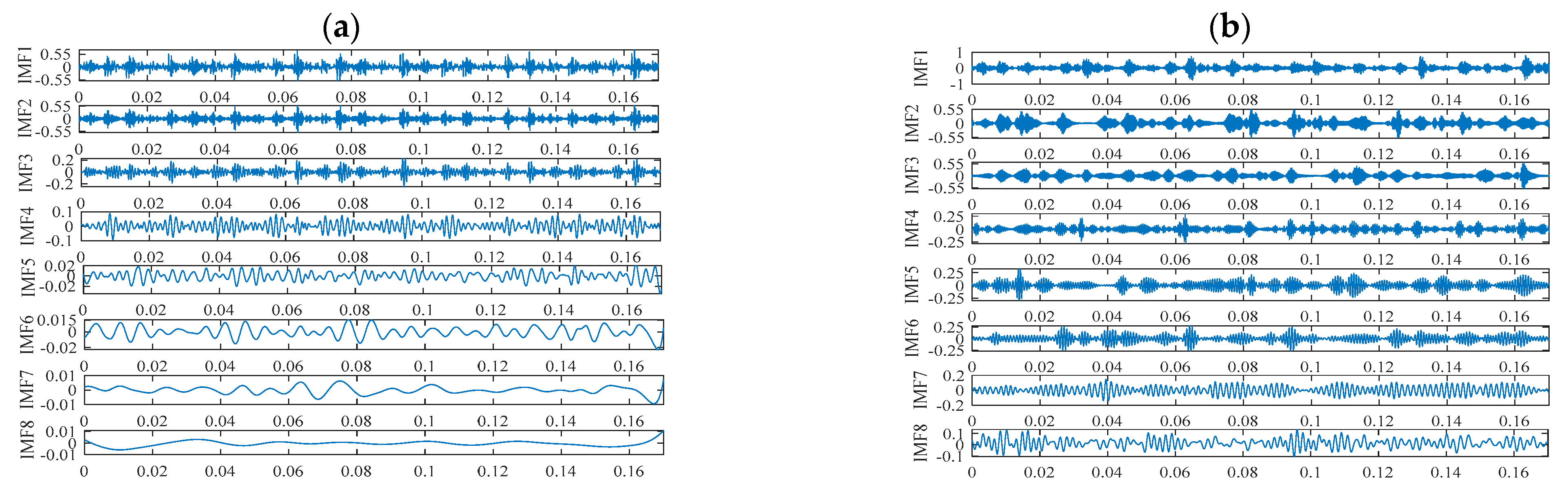 Table 9, the correlation coefficient of IMF8 for FCEEMD is negative (−0.006). This indicates a weak negative correlation between IMF8 and the original signal, which may arise from phase inversion or residual noise components during the FCEEMD decomposition process. However, the absolute value is very small (close to zero), implying that IMF8 has negligible correlation with the original signal. According to the dual-threshold screening criterion (Cor threshold = 0.148), IMF8 is not selected as an effective IMF for signal reconstruction. Therefore, this negative value does not impact the subsequent fault feature extraction and diagnosis results.