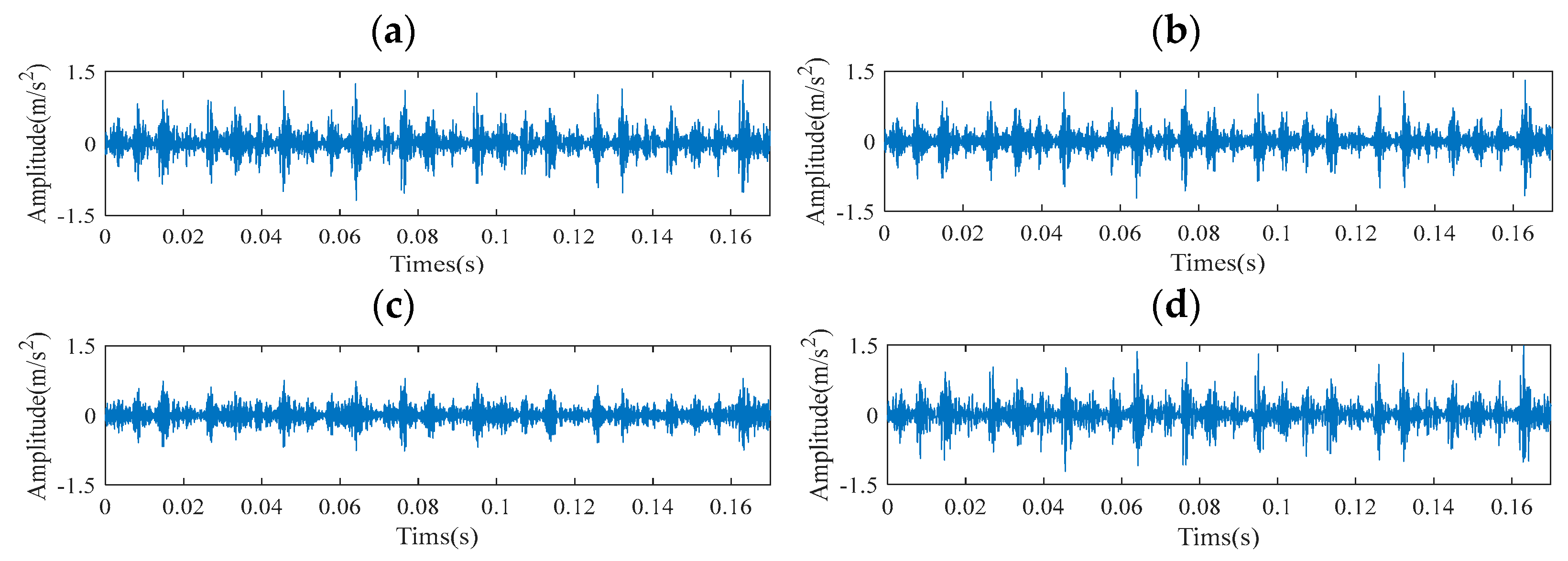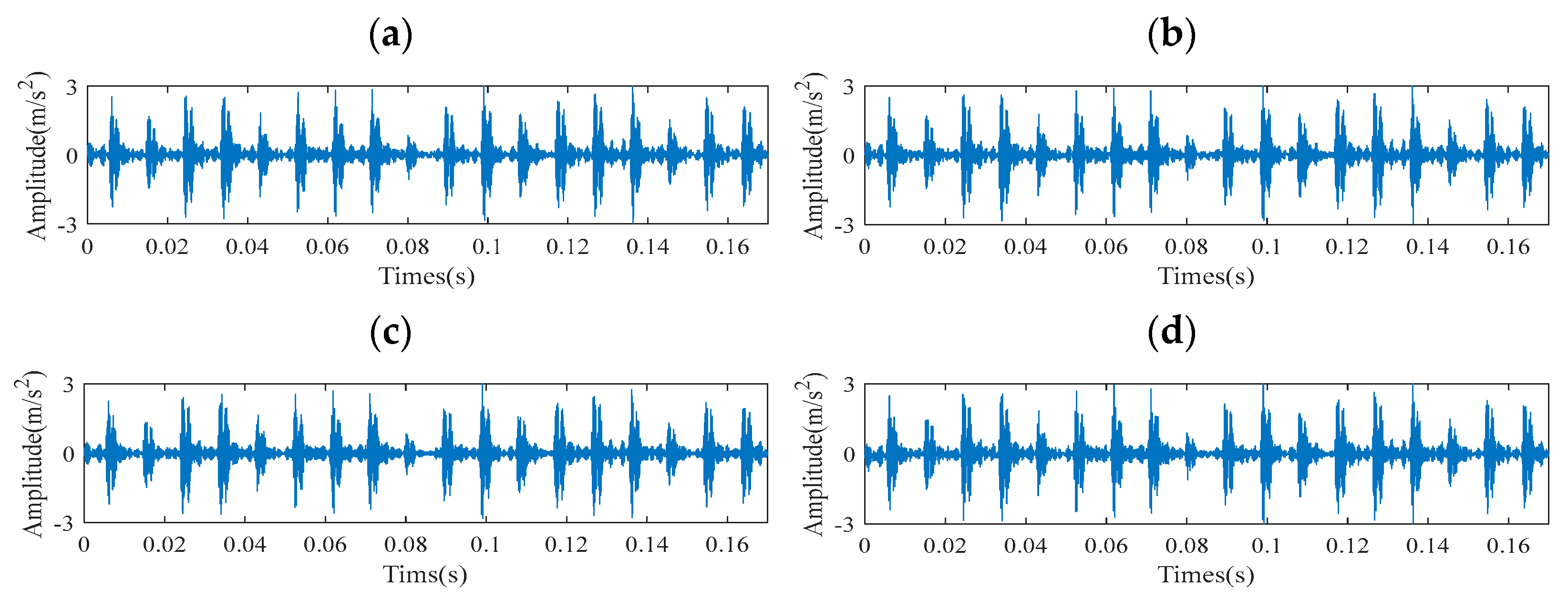 Figure 12a contains fewer edge burrs, which indicates that compared with the other three methods, the signal obtained by FCEEMD-ACYCBD method contains fewer noise components and more periodic pulse components. This demonstrates that the FCEEMD-ACYCBD method possesses high time-frequency resolution, enabling it to effectively capture transient impulses and track frequency variations in signals. In conclusion, compared with other methods, FCEEMD-ACYCBD method can effectively extract fault characteristic frequency components, reduce noise disturbance, and improve signal resolution, thus enhancing the ability to detect and diagnose faults.