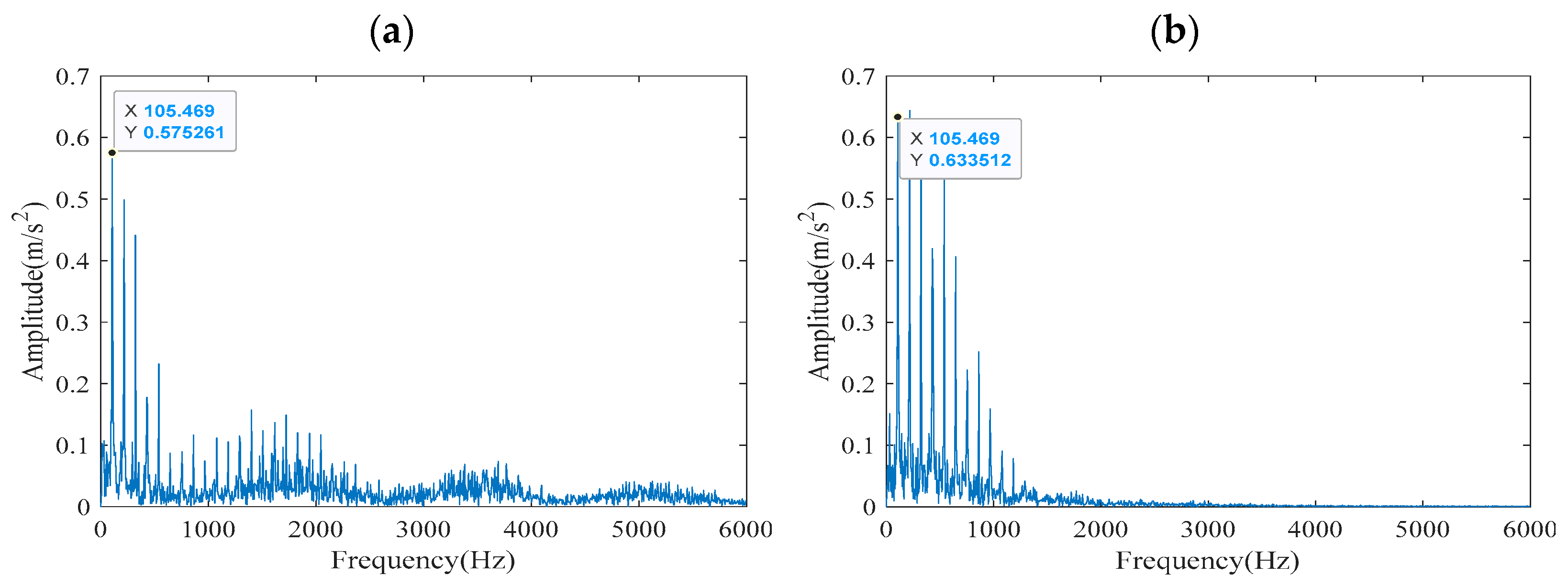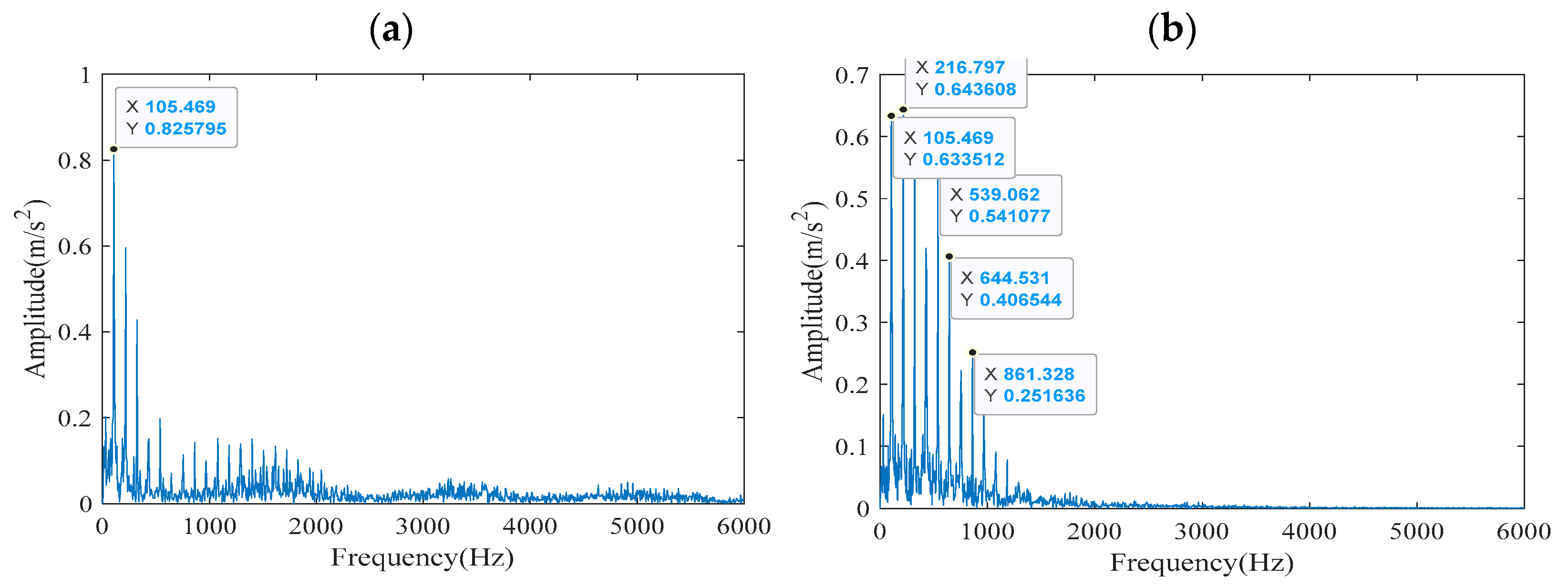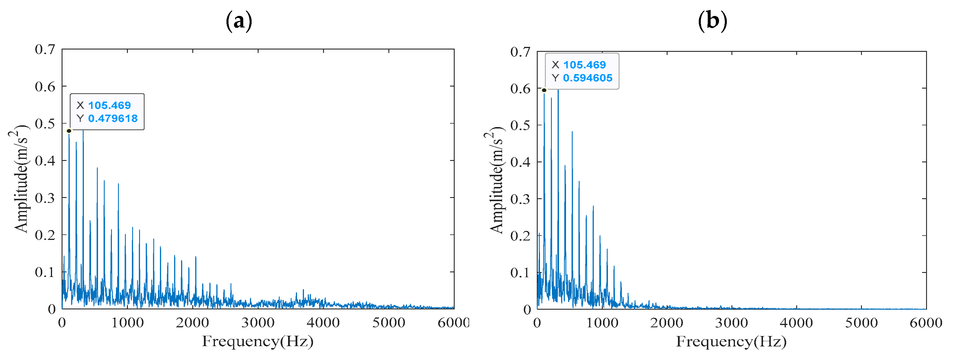 Figure 20 shows the performance of the FCEEMD-ACYCBD signal in the frequency domain. It is evident that the frequencies obtained by the FCEEMD-ACYCBD method are mainly concentrated in 0–2000 Hz, and the fault feature frequency of 105.469 Hz and its multiplier are obvious. Moreover, the FCEEMD-ACYCBD method is the least affected by noise, in contrast with the other three methods. In summary, the FCEEMD-ACYCBD method boasts the benefits of rapid decomposition speed, high precision, and little influence from noise in the course of fault feature extraction.