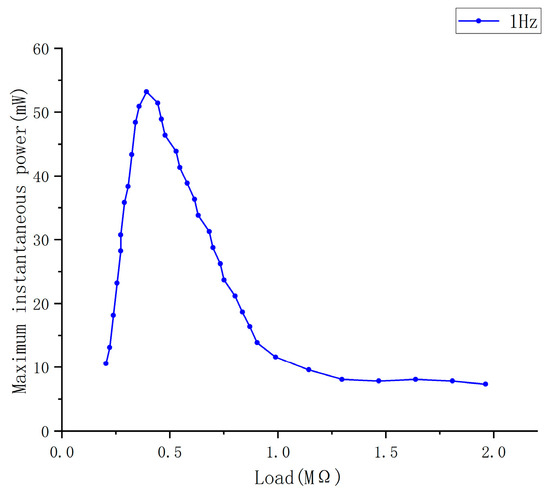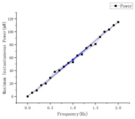 - A piezoelectric energy-harvesting test of the prototype was conducted under loading by a universal testing machine. Under a uniformly distributed load of 800 N at a frequency of 1 Hz, the maximum output power of the PEHS prototype for self-powered ski boots reached 57.44 mW, with a matching load resistance of 404 kΩ. Under uniformly distributed loads of 800 N at frequencies ranging from 0.1 to 2 Hz, the instantaneous maximum power generated by the prototype (at the optimal matching impedance for each frequency) exhibited an approximately linear relationship with the loading frequency.