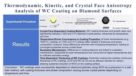 Wang, S.; Meng, Q.; Mao, X.; Yuan, M.; Huang, S.; Qiu, Y. Thermodynamic, Kinetic, and Crystal Face Anisotropy Analysis of WC Coating on Diamond Surfaces. Coatings 2025, 15, 1298. https://doi.org/10.3390/coatings15111298
