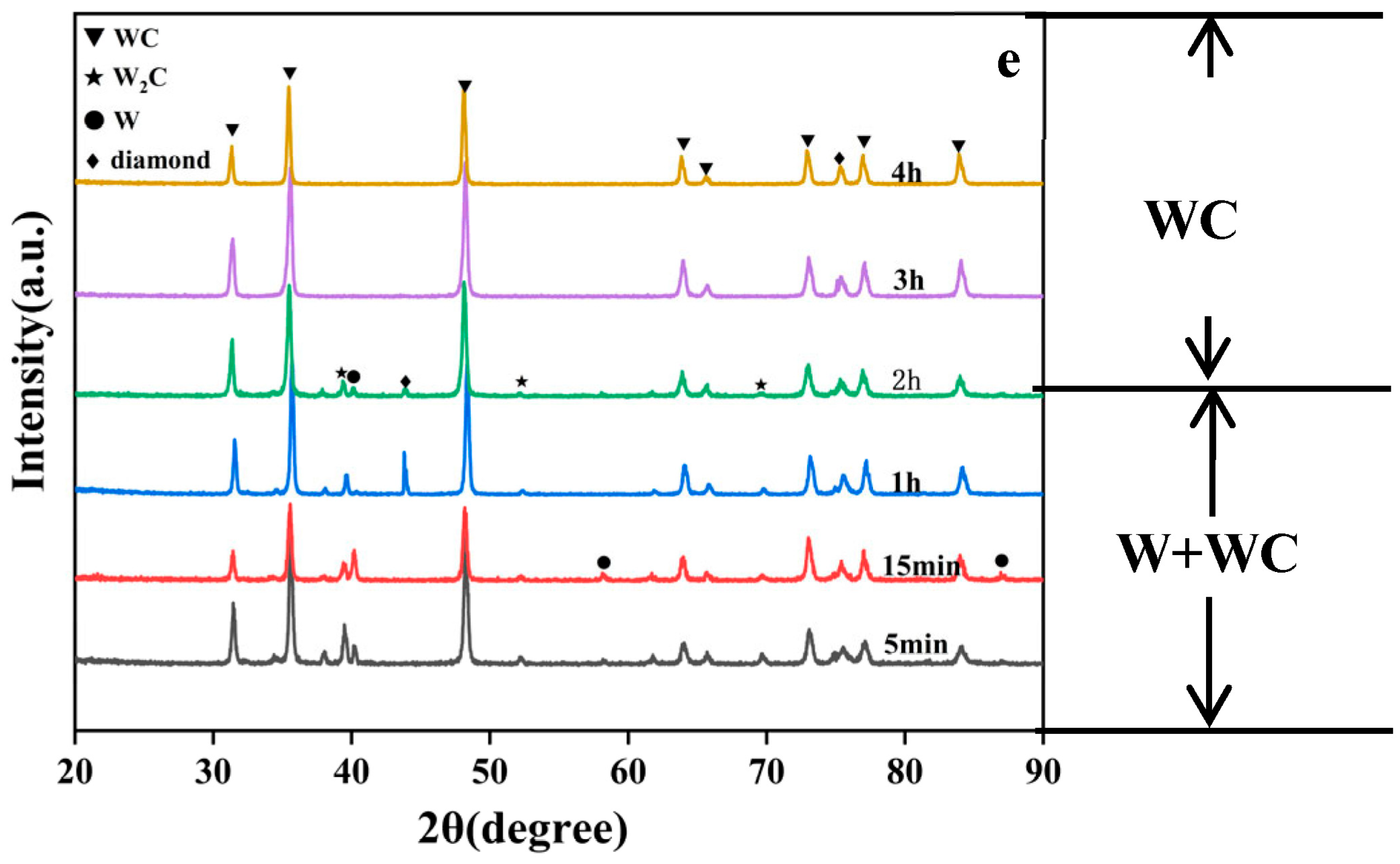 The experimental observations align with these thermodynamic predictions. Initially, the reduction of tungsten trioxide produces tungsten dioxide (WO2), which further reacts with carbon to form metallic tungsten (W). This intermediate tungsten phase is then converted into tungsten carbide (WC) through subsequent reactions.