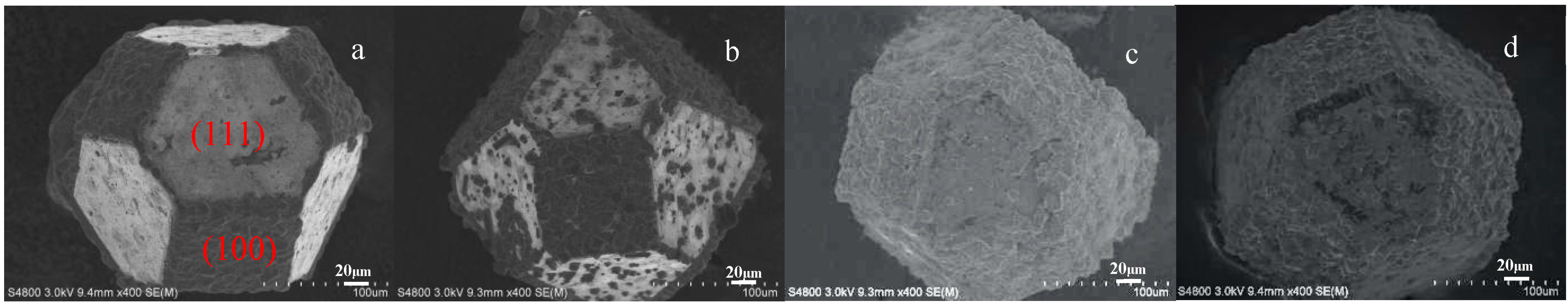 Figure 4 presents the SEM images of coated diamond particles synthesized at 1050 °C for varying holding times: 30 (a), 60 (b), 90 (c), and 120 min (d). The SEM analysis reveals distinct morphological differences in coating coverage between the (100) and (111) crystal faces. At a holding time of 30 min (Figure 4a), the (100) crystal face exhibits complete coating coverage, while the (111) face shows negligible coating formation. As the holding time increases to 60 min (Figure 4b), initial coating nucleation is observed on the (111) face, though a continuous layer has not yet formed. When the holding time exceeds 90 min (Figure 4c,d), the diamond particles are fully encapsulated by the coating layer. Similar observations of crystallographically dependent coating behavior have been reported in previous studies on diamond surface coatings [25,26,27].
