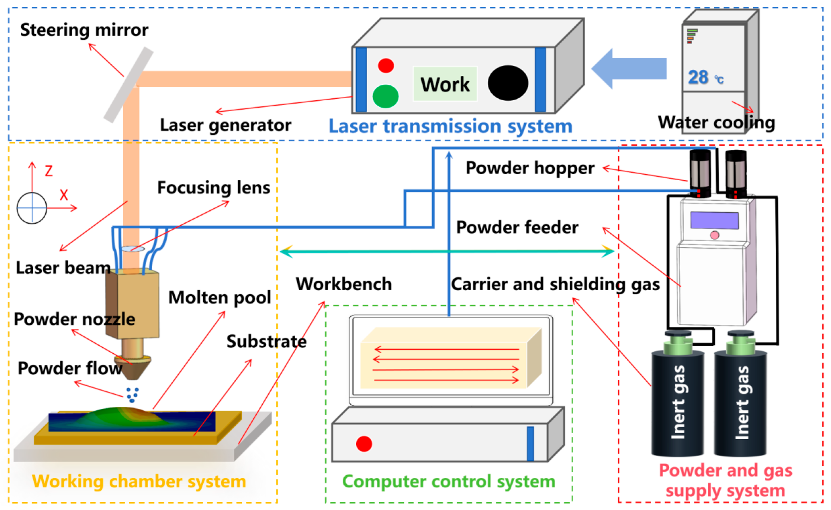 The laser model is a Nanjing Zhongke Yucheng Laser Technology Co., Ltd. YLR-1000 fiber laser with a maximum power of 1000 W, equipped with an Nanjing Zhongke Yucheng Laser Technology Co., Ltd. RC52 laser head. The standard focal length is 150 mm, the focused focal length is 300 mm, the working distance is 16 mm, and the spot diameter is 0.6 mm. The water chiller circulates cooling water to the external optical path system, and the powder feeder is an RC-PGF-D-2 dual-hopper negative-pressure powder feeding device. The complete laser-directed energy deposition (L-DED) system is integrated into a vertical machining center, as illustrated in Figure 1. The system exhibits high transmission accuracy, meeting the precision requirements for laser-directed energy deposition processes. To prevent high-temperature oxidation reactions of metal powders in the deposition zone, argon gas is employed as both the powder carrier gas and shielding gas. The process flow of laser-directed energy deposition (L-DED) is illustrated in Figure 2.