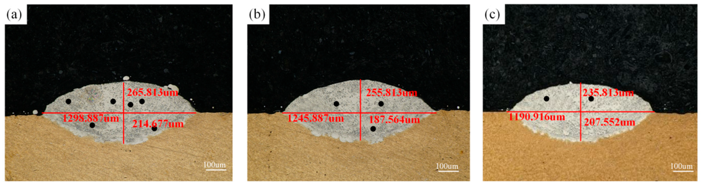 Fine pores and cracks within the deposited layer are difficult to eliminate solely through process parameter optimization. Substrate preheating is shown to effectively reduce the likelihood of cracking during the formation of the nickel-based transition layer on chromium-zirconium-copper alloys. The metallographic cross-sections of layers deposited with substrate preheating at 200 °C, 300 °C, and 400 °C are presented in Figure 3. As the preheating temperature increases, the temperature gradient between the deposited layer and the substrate is significantly reduced, which lowers residual stress and mitigates stress concentration within the layer, thereby suppressing crack formation. In addition, preheating markedly decreases the generation of pores and cracks, with porosity exhibiting a declining trend as temperature rises. Compared to preheating at 200 °C and 300 °C, the layer prepared at 400 °C demonstrates superior interfacial bonding quality. At this temperature, a dilution rate of 46% and an aspect ratio of 5 are achieved, meeting the requirements for substrate-coating interfacial integrity while preventing potential coating collapse.