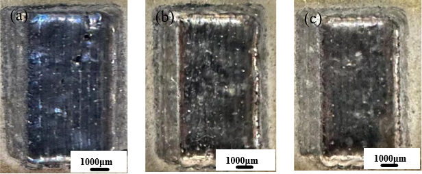 Figure 4. Macroscopic morphology of coatings with different TiB2 contents. (a) Ni60AA + 1 wt.%TiB2; (b) Ni60AA + 2 wt.%TiB2; (c) Ni60AA + 3 wt.%TiB2.