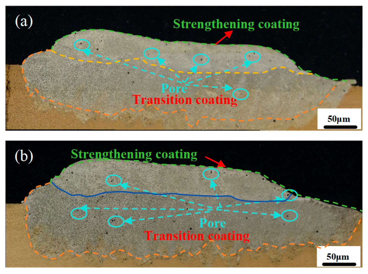 As shown in Figure 7, it contains 2 wt.% TiB2 and 3 wt.% TiB2 coating microstructures. As illustrated in Figure 7a, when the TiB2 content is increased to 2 wt.%, the amount of TiB2 in the reinforced coating further increases, with unmelted TiB2 particles uniformly distributed in the molten pool. The reinforced coating exhibits a well-formed morphology, with significantly improved hardness and wear resistance. Only a few tiny pores with diameters around a few micrometers are present, and no obvious pores or crack defects are observed. As shown in Figure 7b, it can be observed that when the TiB2 content is increased to 3 wt.%, the amount of TiB2 in the reinforced coating further increases, with unmelted TiB2 particles uniformly distributed in the molten pool. The reinforced coating exhibits a well-formed morphology, with even greater improvements in hardness and wear resistance, and no significant pores or crack defects are present.