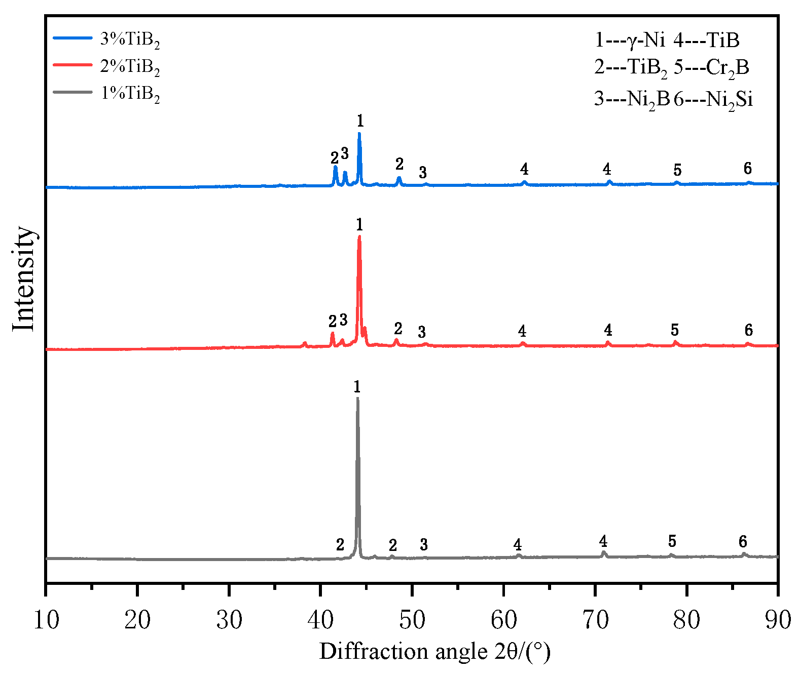 The content of TiB2 is 1 wt. %, 2 wt. %, 3 wt. As shown in Figure 8, the phases of the coating are mainly γ-Ni, TiB2, NI2B, and a small amount of TiB, CR2B, Ni2Si, etc. The results show that some TiB2 particles react with Ni-based alloy elements to form new hard phases during laser melting. Laser focusing on the surface of the substrate will produce extremely high temperatures, resulting in partial or total melting of TiB2 particles and reacting with elements such as Ni and Cr. The partial decomposition of TiB2 yields TiB and B, which are soluble in Ni-based liquids. At high temperatures, Ti and B elements diffuse with Ni and Cr atoms to form new hard phases. During the cooling process, these elements precipitate and form crystal nuclei, and finally form new hard phases with high hardness and strength, which enhance the coating performance. In the XRD patterns of the three samples, the diffraction peaks are basically the same, but the peak intensities are different. With the increase in the proportion of TiB2, the diffraction peak is gradually weakened, indicating that the amount of decomposition of TiB2 is reduced. When the proportion of TiB2 is small, the melting of Ni is higher and the fluidity of the molten pool is stronger, which is conducive to the diffusion of B atoms and promotes the reciprocating chemical reaction between TiB2 and TiB, B.