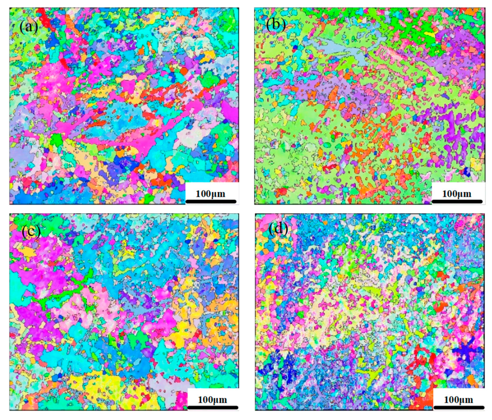 To investigate the influence of TiB2 addition on the grain structure of Ni60AA reinforced coatings, electron backscatter diffraction (EBSD) analysis is performed, as shown in Figure 9. The results reveal that the grain size and morphology undergo significant changes with increasing TiB2 content. As shown in Figure 9a, in the absence of TiB2, the top region of the coating is dominated by coarse columnar grains with a pronounced preferential orientation, indicating a strong temperature gradient during solidification and a cooling rate insufficient to suppress columnar grain growth. As displayed in Figure 9b, when TiB2 content is increased to 1 wt.%, the grain size of the coating begins to decrease, and some columnar grains are refined to form a certain number of equiaxed grain zones. As depicted in Figure 9c, with an increase to 2 wt.%, the grains are further refined, the columnar grains are largely broken, the proportion of equiaxed grains is significantly increased, and the grain boundary distribution tends to be uniform. As shown in Figure 9d, the TiB2 content is 3 wt.%, the grains at the top of the coating are almost completely transformed into fine equiaxed grains with uniform distribution, the grain size is significantly reduced, and the density of the microstructure is improved. The evolution of microstructure shows that TiB2 particles play the role of grain refiner in the cladding process. As a heterogeneous nucleation core, TiB2 improves the nucleation rate, and its high melting point and stability help to hinder grain growth during solidification, inhibiting the preferential growth of columnar crystals, and thus promoting the formation of equiaxed grains.