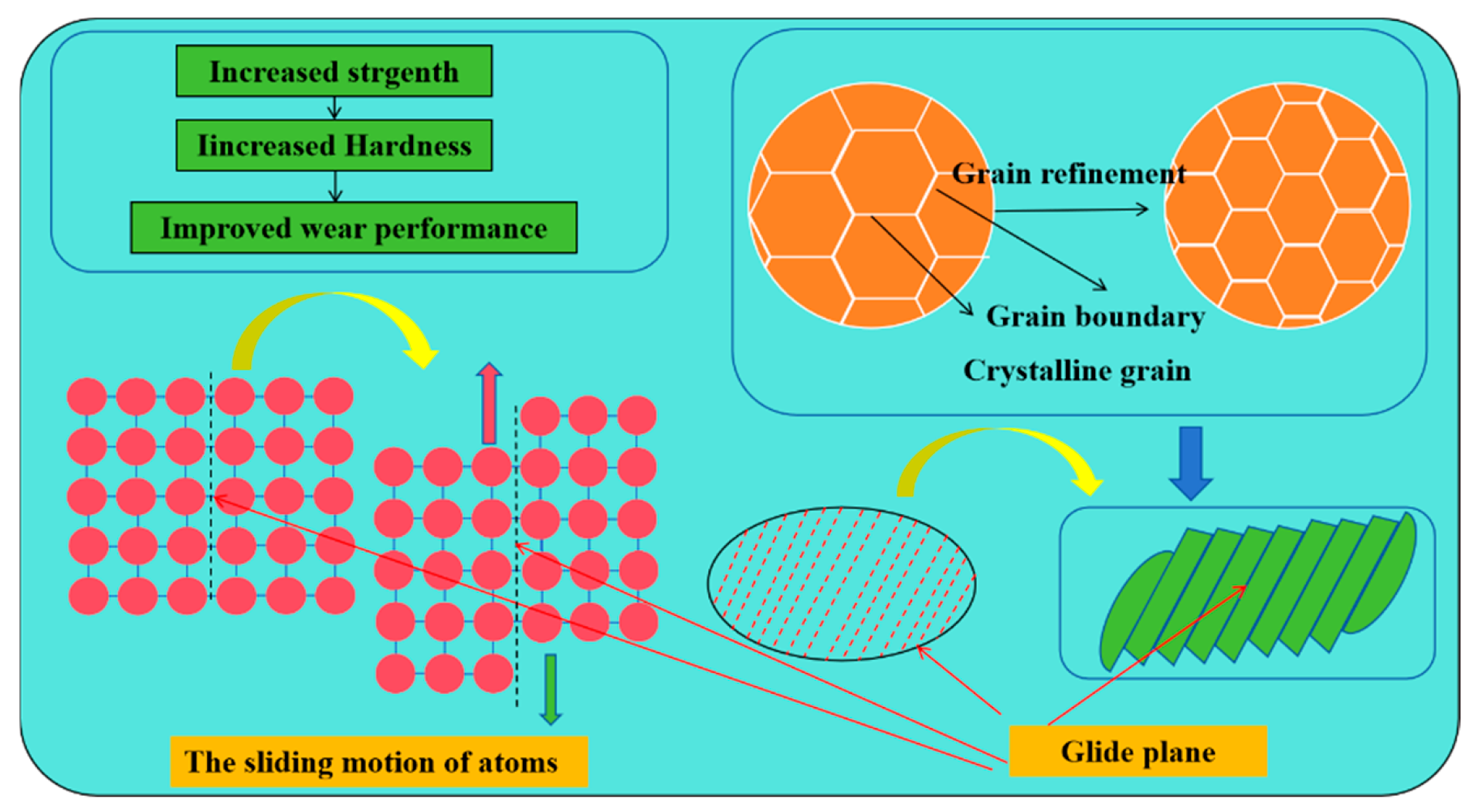 The relationship between grain refinement and mechanical properties can be quantitatively described. As shown in Equation (1), the Hall-Petch equation indicates that a reduction in grain size leads to an increase in the material’s yield strength. Given the intrinsic correlation between hardness and strength, smaller grain dimensions similarly contribute to increased hardness. As illustrated in Figure 11, this strengthening mechanism arises from the proliferation of grain boundaries per unit volume during grain refinement. These boundaries exhibit disordered atomic arrangements, elevated free energy, and heightened dislocation density. When dislocations propagate through the lattice and encounter grain boundaries, their motion is impeded by interactions with boundary dislocations, thereby elevating the material’s resistance to plastic deformation and ultimately improving hardness. Furthermore, the Archard wear model, as shown in Equation (2), predicts that enhanced hardness directly correlates with reduced wear volume, emphasizing the critical role of grain refinement in optimizing wear resistance.