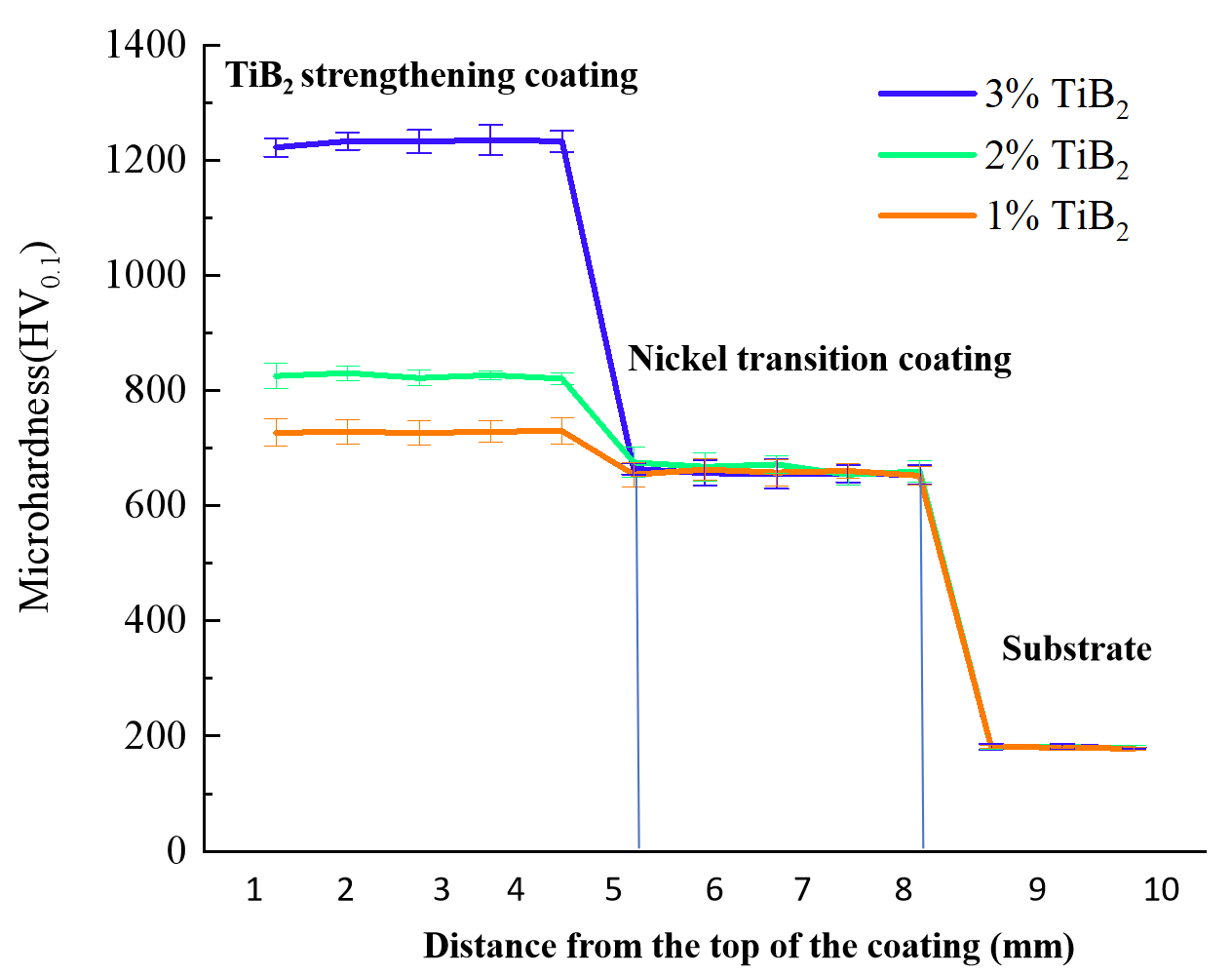 Figure 12. The microhardness distribution of the coatings with different TiB2 additions.