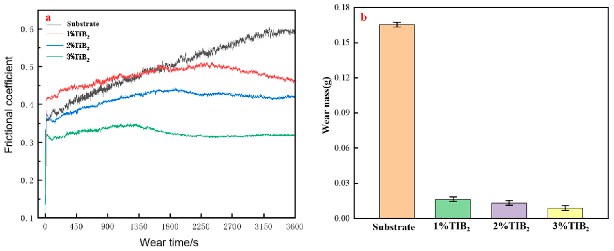 When the TiB2 content was 3 wt.%, significant grain refinement was observed, with coarse columnar grains transforming into fine equiaxed grains. The wear depth was measured at 97.09 µm, the hardness reached 1225.3 HV0.1, the wear mass loss was only 0.0089 g, and the friction coefficient remained stable at 0.32.