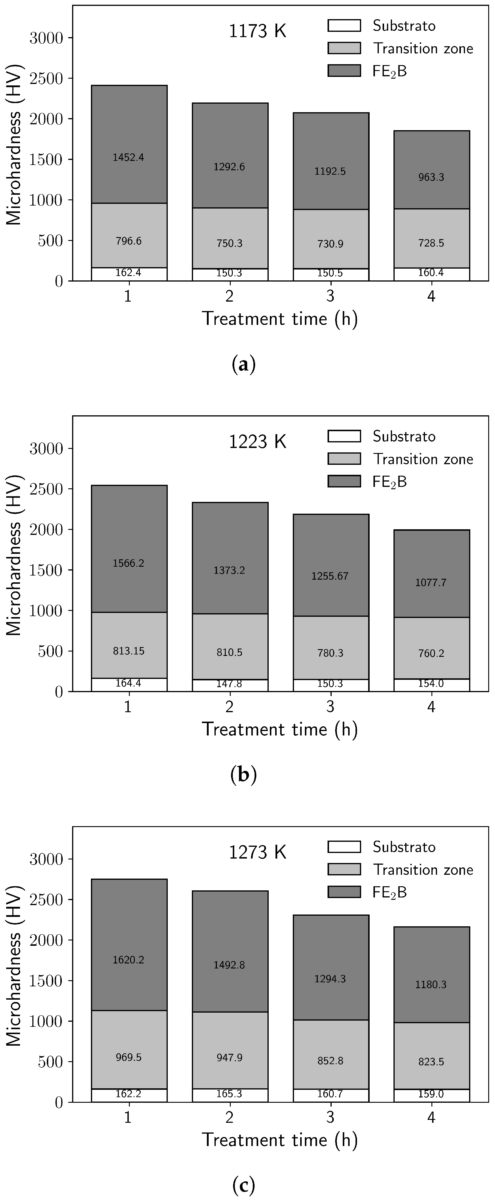 - The Fe2B layers developed on the steel surface exhibited a saw-tooth morphology, and their thickness increased with the boriding temperature. The maximum boride layer thickness was recorded in the sample subjected to boriding at 1273.15 K, with a measurement of 69.35