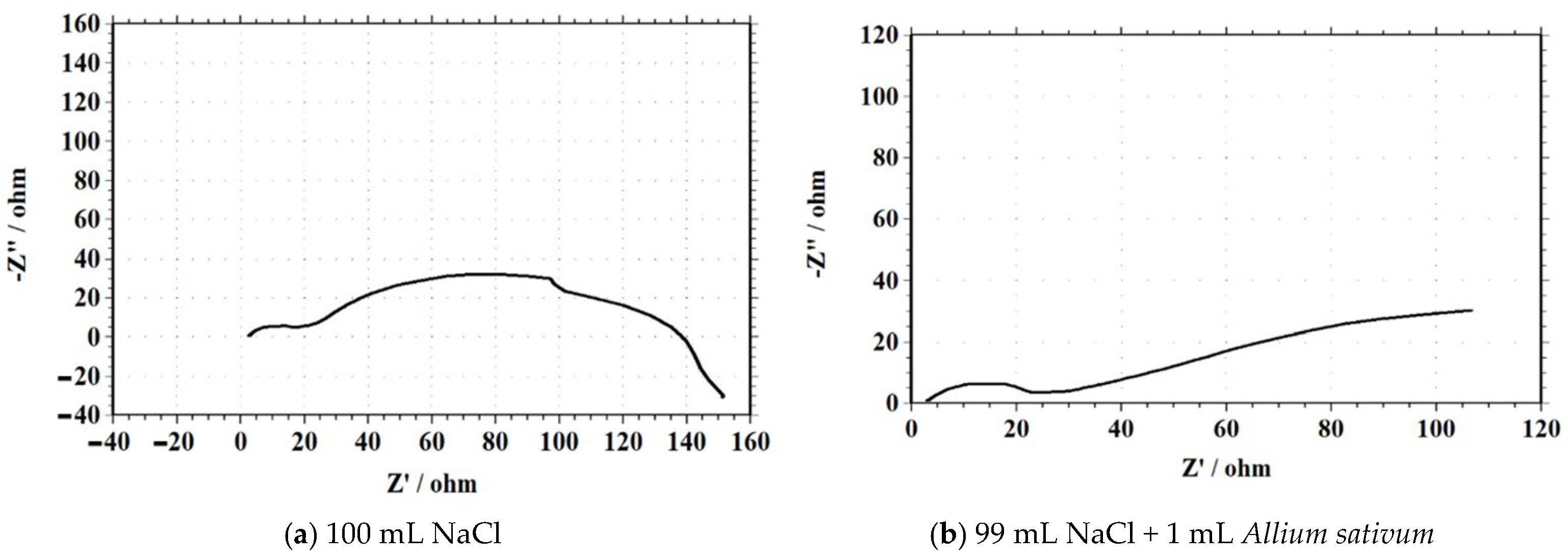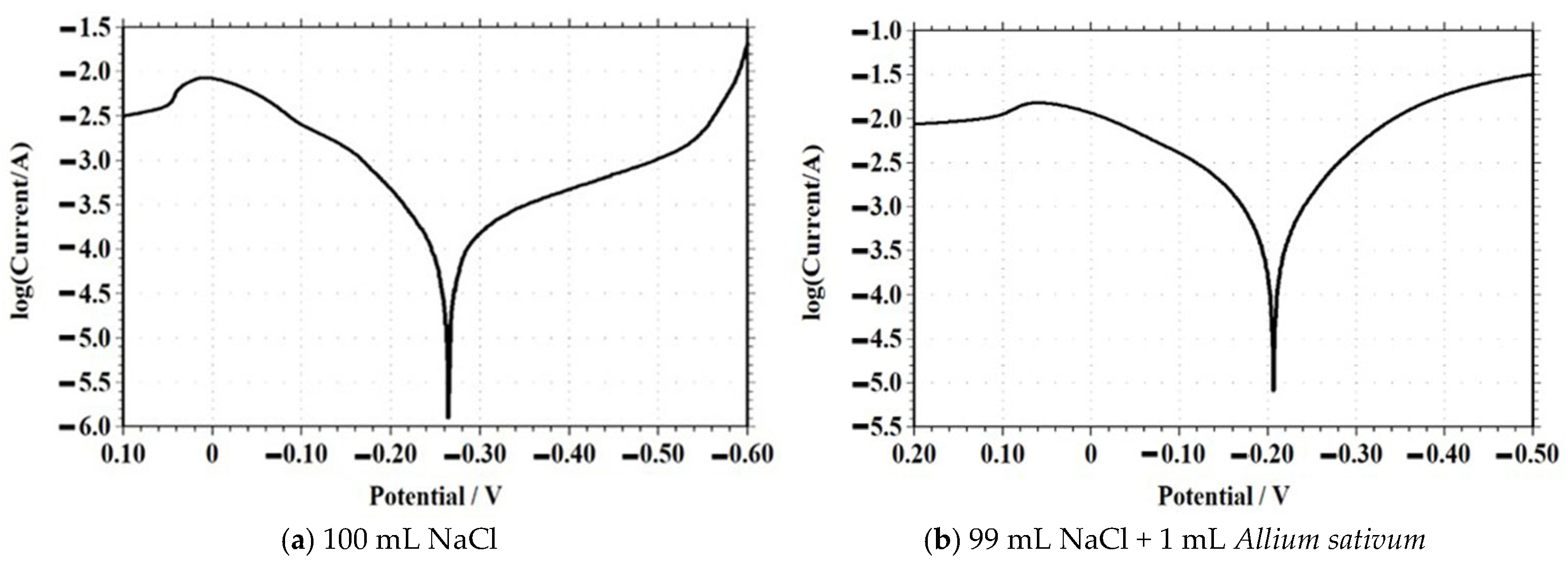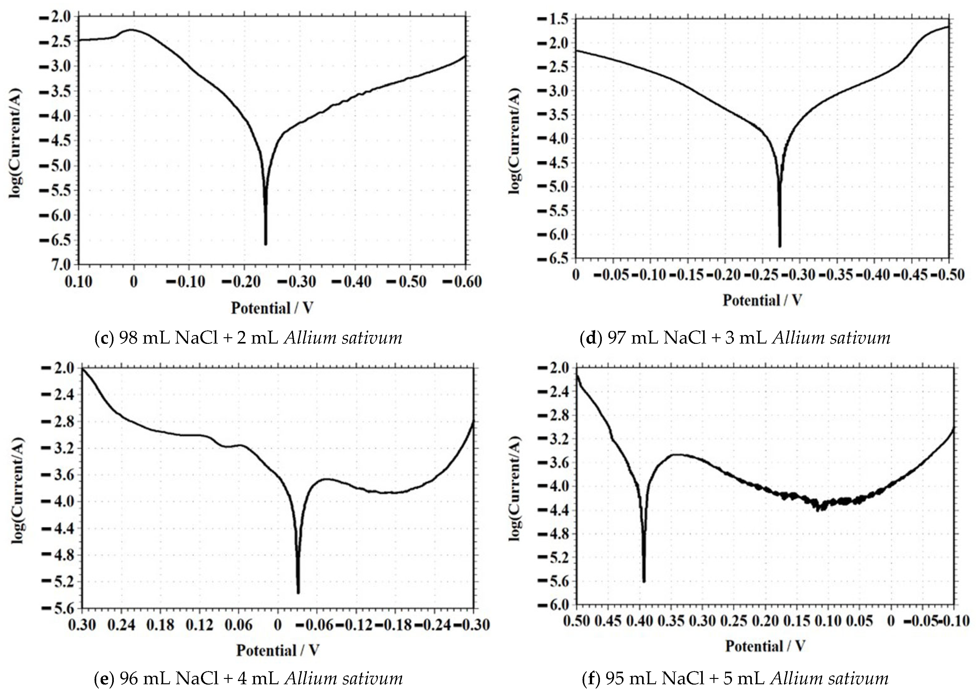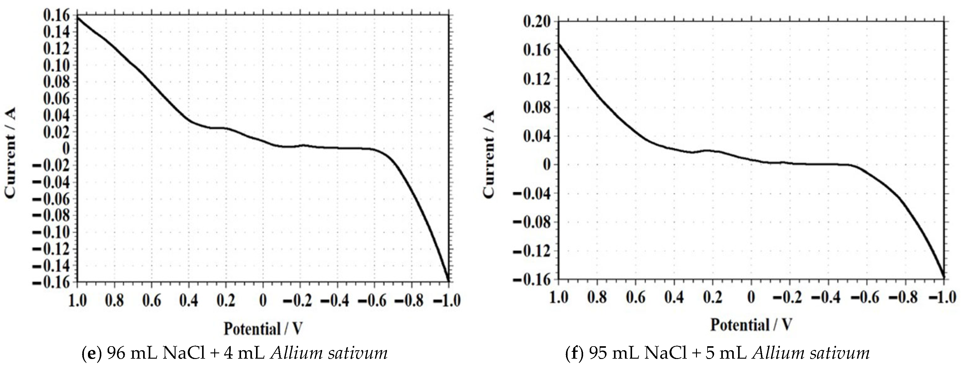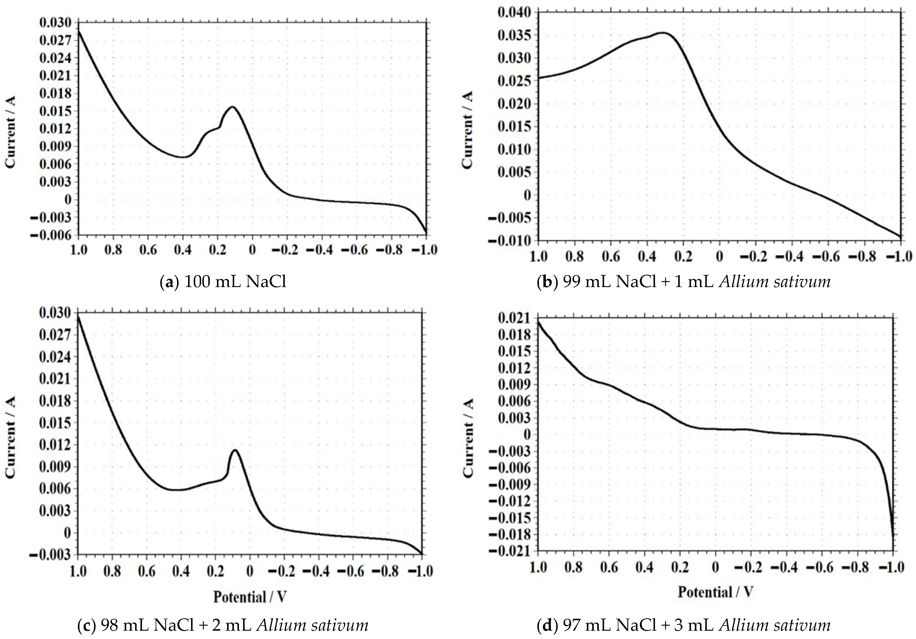 | Solution Composition (NaCl + Allium sativum) | Peak Current (A) | Peak Potential (V) | Observation |