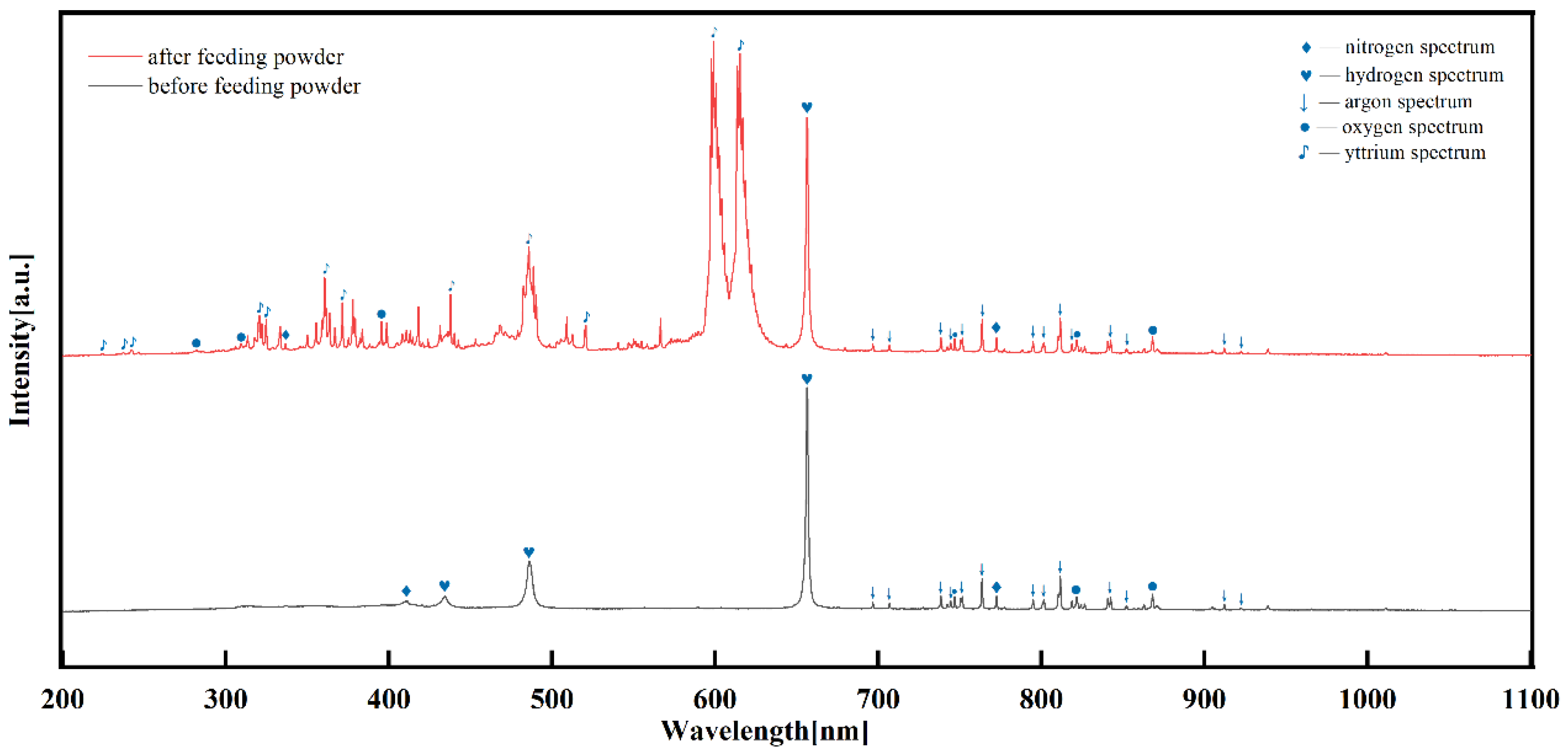Figure 2 displays the plasma spectra acquired before and after powder feeding. The spectrum recorded prior to powder injection shows characteristic atomic emission lines of argon, nitrogen, and hydrogen. In addition, oxygen atomic lines are observed at 746.9 nm, 821.6 nm, and 868.1 nm, which are likely attributable to the dissociation of oxygen and water vapour from the ambient air. In contrast, the spectrum obtained after powder feeding exhibits, besides the lines from the plasma-forming gases and oxygen, numerous new emission lines in the short-wavelength ultraviolet and visible regions. Most of these new lines are emitted by excited yttrium atoms. Notably, the two most intense lines in the visible region, located at 598.9 nm and 615.1 nm, along with a prominent line at 437.8 nm—which serves as a key analytical line for yttrium ions—are clearly observed. The emergence of these yttrium-related lines, particularly the line at 437.8 nm, provides direct evidence of the excitation of yttrium species and confirms the presence of Y