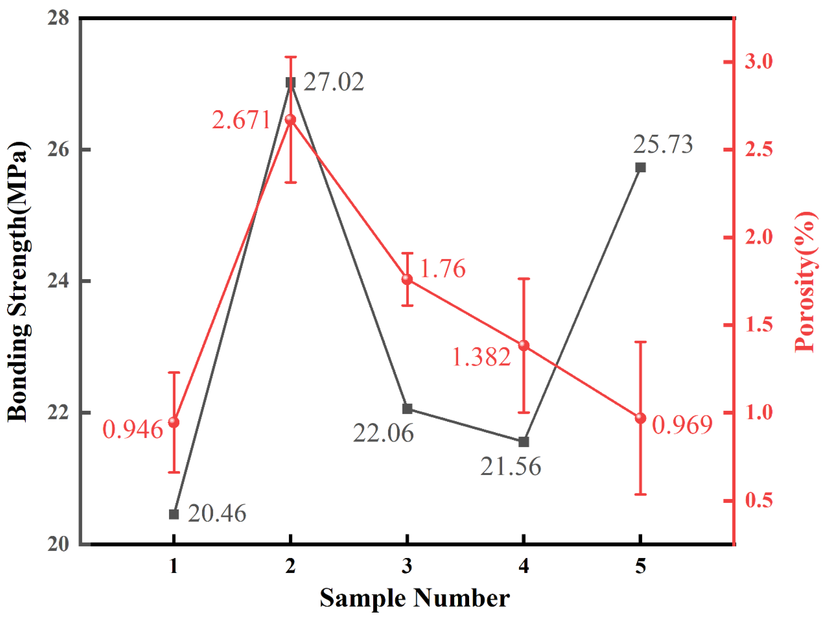 Figure 6 presents the calculated porosity values with statistical errors and the measured adhesion strengths for all five samples. The results indicate a positive correlation between the porosity and the proportion of the water ring flow rate: a higher proportion of water ring flow rate corresponds to greater coating porosity. Sample 1 (Water Ring Flow Rate Ratio: 79.66%), with the lowest water ring flow rate proportion of 79.66%, exhibited the lowest porosity among all samples, measuring 0.946%. Sample 5 (Water Ring Flow Rate Ratio: 80.28%) had the next lowest porosity value of 0.969%, with a water ring flow rate proportion of 80.28%. Based on the coating thickness data presented in