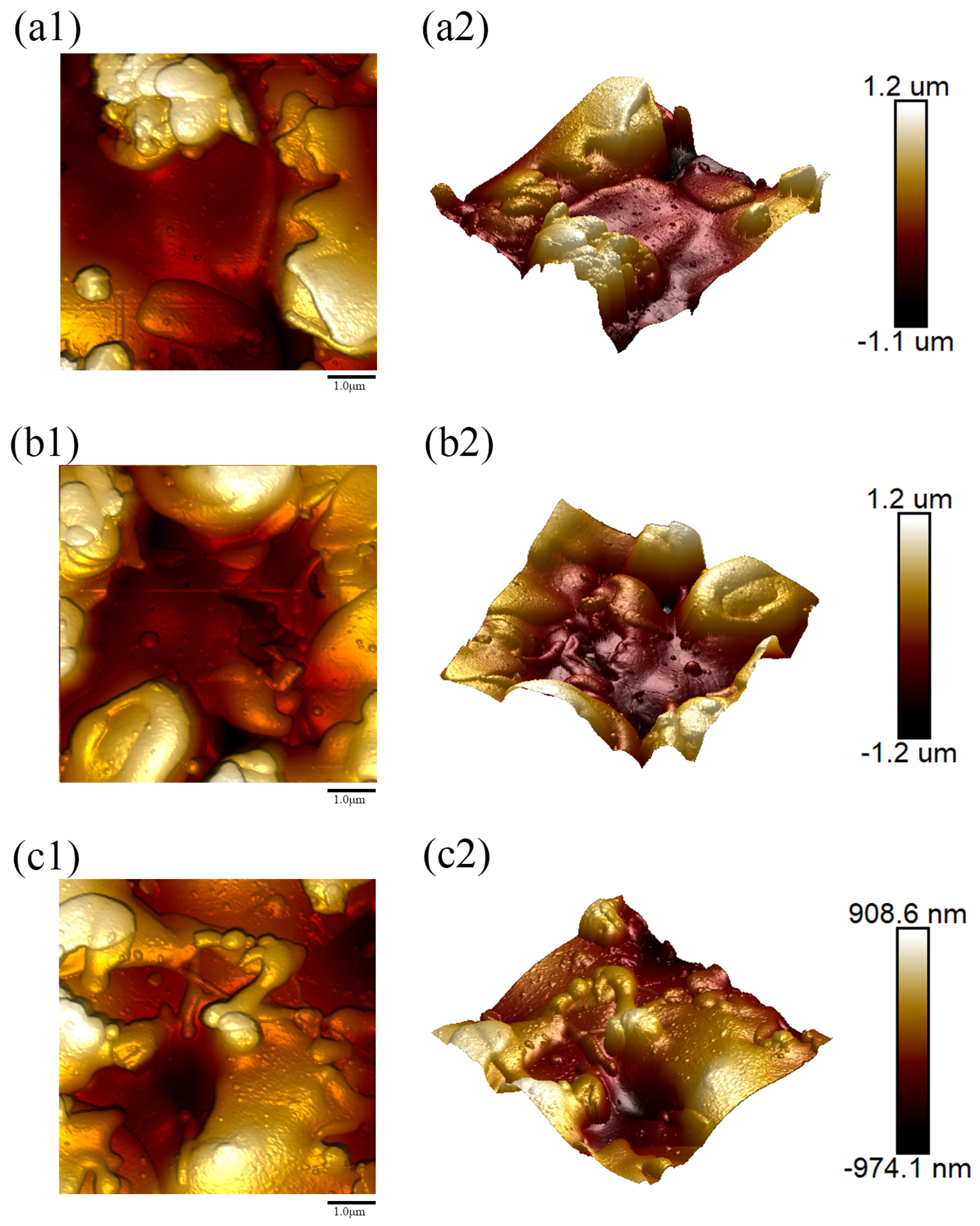 Figure 12(a2–c2) represent the corresponding three-dimensional (3D) surface morphology images. The image dimensions for the test area were uniformly 5 μm × 5 μm. For each sampling region, the mean roughness (