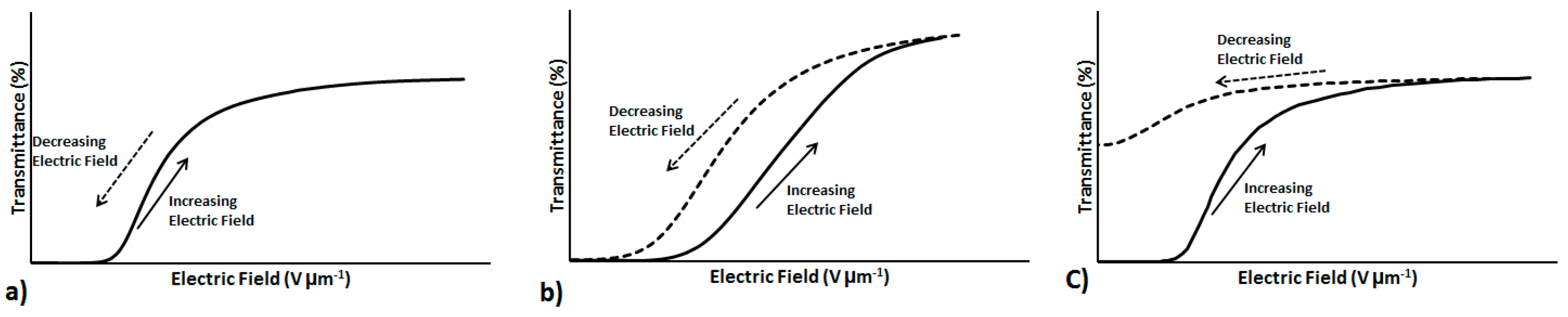 - Han, J. Study of Memory Effects in Polymer Dispersed Liquid Crystal Films. J. Korean Phys. Soc. 2006, 49, 1482–1487. [Google Scholar]