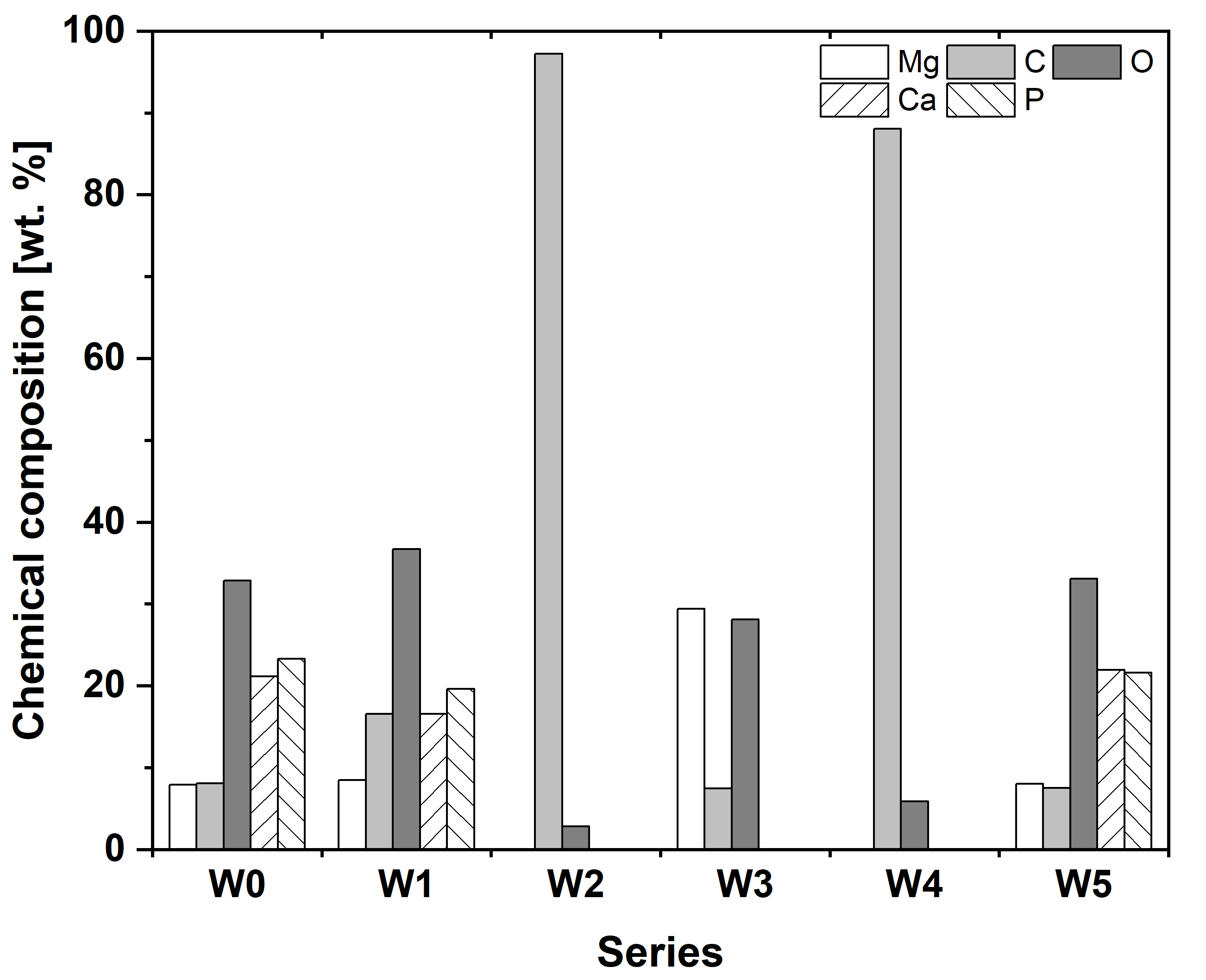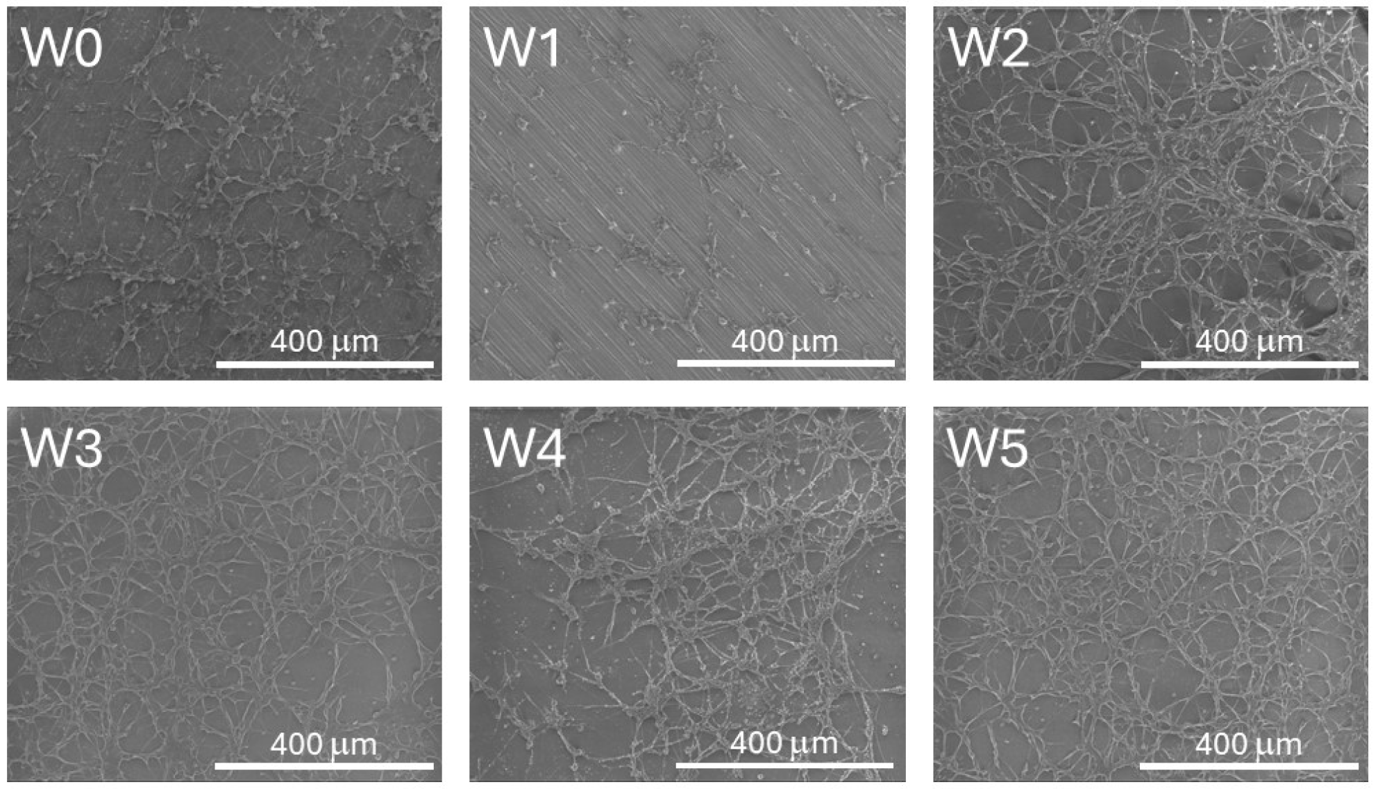 - Preliminary surface treatment allowed the successful removal of impurities and made a positive impact on the surface finish, increasing microscopic unevenness on the alloy surface of the W1 sample series. This effect allowed for obtaining continuous and well-adherent to the metallic core biopolymer coatings after deposition and also durability tests in SBF solution (except for the samples of W5 series).
