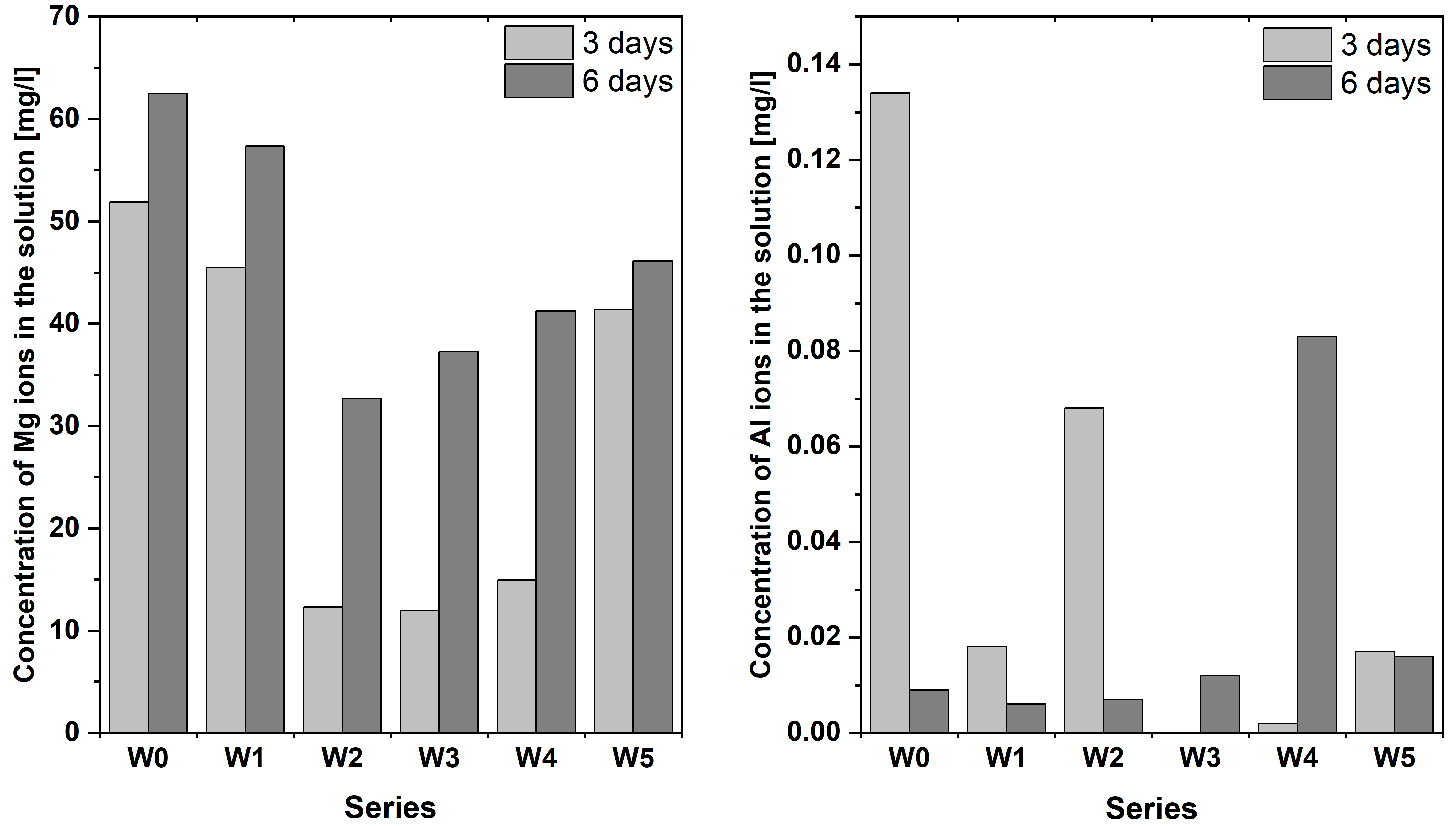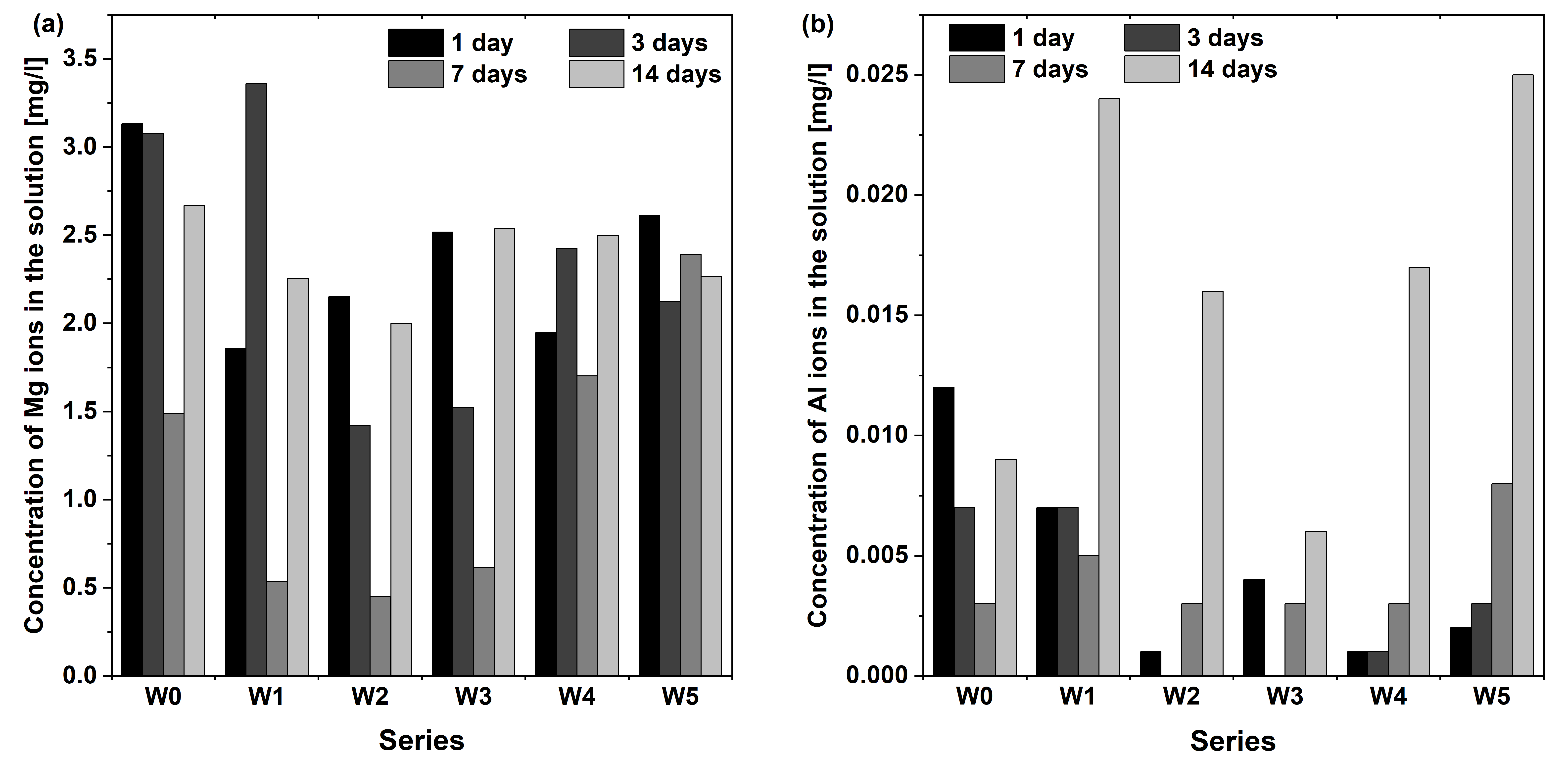 - The proposed surface modifications, by depositing PLA and PLGA layers on AZ31 alloy, improved its resistance to corrosion in the applied simulated body fluid (SBF) solution. Layers of the W2 and W4 series preserved their continuity and adhesion after 14-day contact with this solution, and, additionally, the W4 series showed the presence of globular structures typical of apatite. This formation on the surface of the obtained biopolymer layers is beneficial for the application of the material in bone implantology. Barrier protection against Al3+ ions release into the SBF solution for initial periods, less than 14 days, was also confirmed. A major and novel finding is that the CA-containing PLA coating (W3) exhibits superior performance in suppressing the long-term release of potentially toxic Al3+ ions into the SBF solution, which is a critical concern for AZ31-based implants.