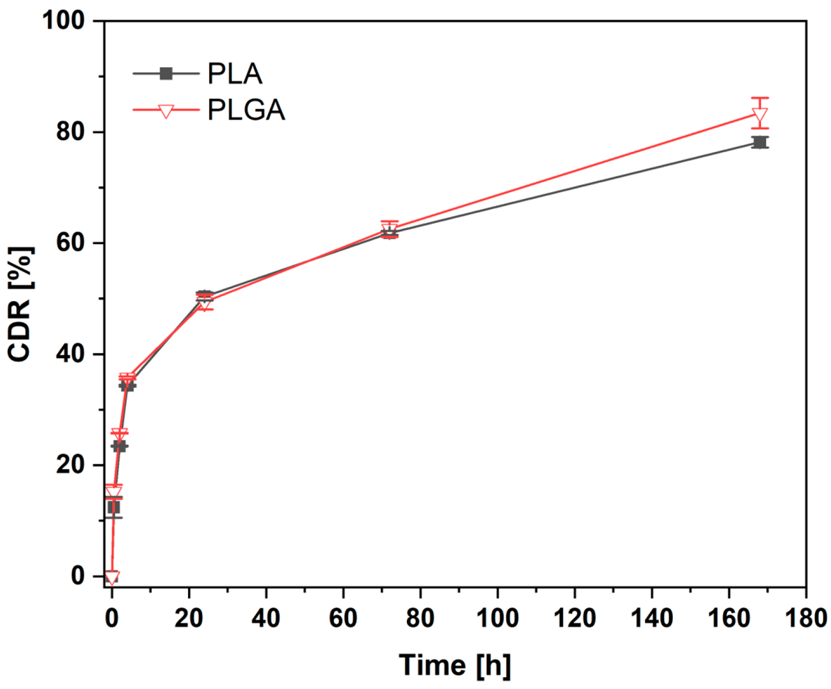 - Efficient CA release with a possible transport mechanism based on the Korsmeyer–Peppas model and with the characteristic initial “burst release” ensures effective antimicrobial agent release at the initial step of curation after implantation, followed by slower release governed by the diffusion and further erosion of the polymeric coating.