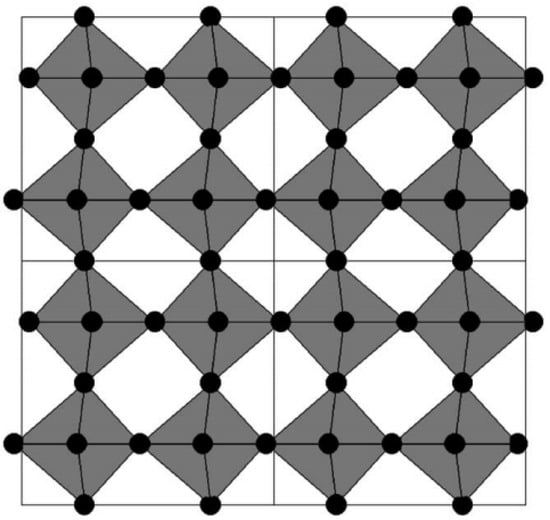 Schematic diagram of the monoclinic WO3 structure. Oxygen atoms are shown in black, and the corner-sharing WO6 octahedra are shaded (adapted from [46], with permission).