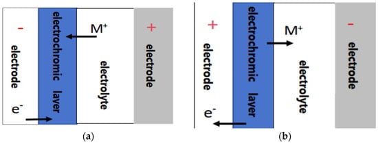 When a negative voltage is applied to the electrochromic layer, as shown in Figure 3a, cations and electrons enter the thin film simultaneously to undergo a redox reaction, generating a tungsten bronze structure, and the thin film changes from colorless to blue [48]; when a positive voltage is applied to the electrochromic layer, as shown in Figure 3b, cations and electrons are extracted from the thin film, W5+ is oxidized toW6+, and the thin film returns to its original colorless and transparent state.