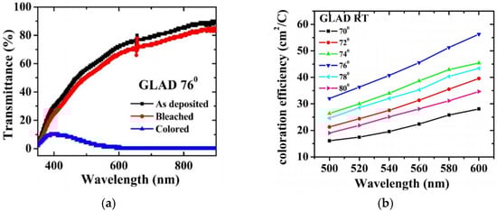 (a) Transmittance spectra of bleached, as-deposited, and colored states of WO3 thin films deposited at 76°; (b) CE of WO3 samples for room temperature (adapted from [60], with permission).