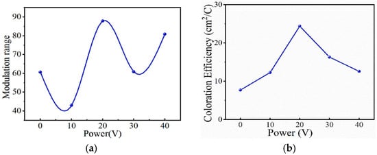 (a) Optical modulation range of thin films under different doping powers; (b) coloring efficiency of thin films under different doping powers (adapted from [61], with permission).