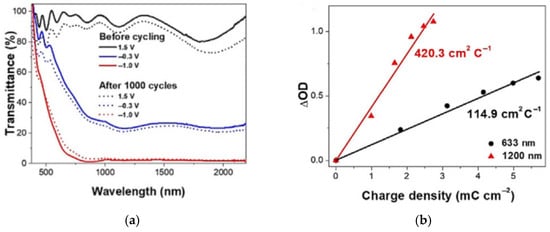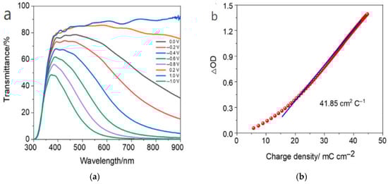 In the formula, ΔOD is the change in optical density; Q represents the amount of charge changed per unit area, while Tc and Tb correspond to the transmittances of the electrochromic film or device in the colored and bleached states at a specific wavelength, respectively. The calculated coloration efficiency (CE) has a unit of cm2/C. This property can be evaluated by performing electrochemical and optical measurements using an electrochemical workstation and a UV-vis spectrophotometer [52]. The current–time curve is recorded during the entire coloring process, and the total injected charge (Q) is obtained by integrating this curve. The optical density (OD) is then calculated from the transmittance measured at 633 nm in both bleached and colored states, enabling the determination of the coloration efficiency (CE) using Equation (3). A higher coloration efficiency indicates that less charge is required to achieve the same optical modulation amplitude.