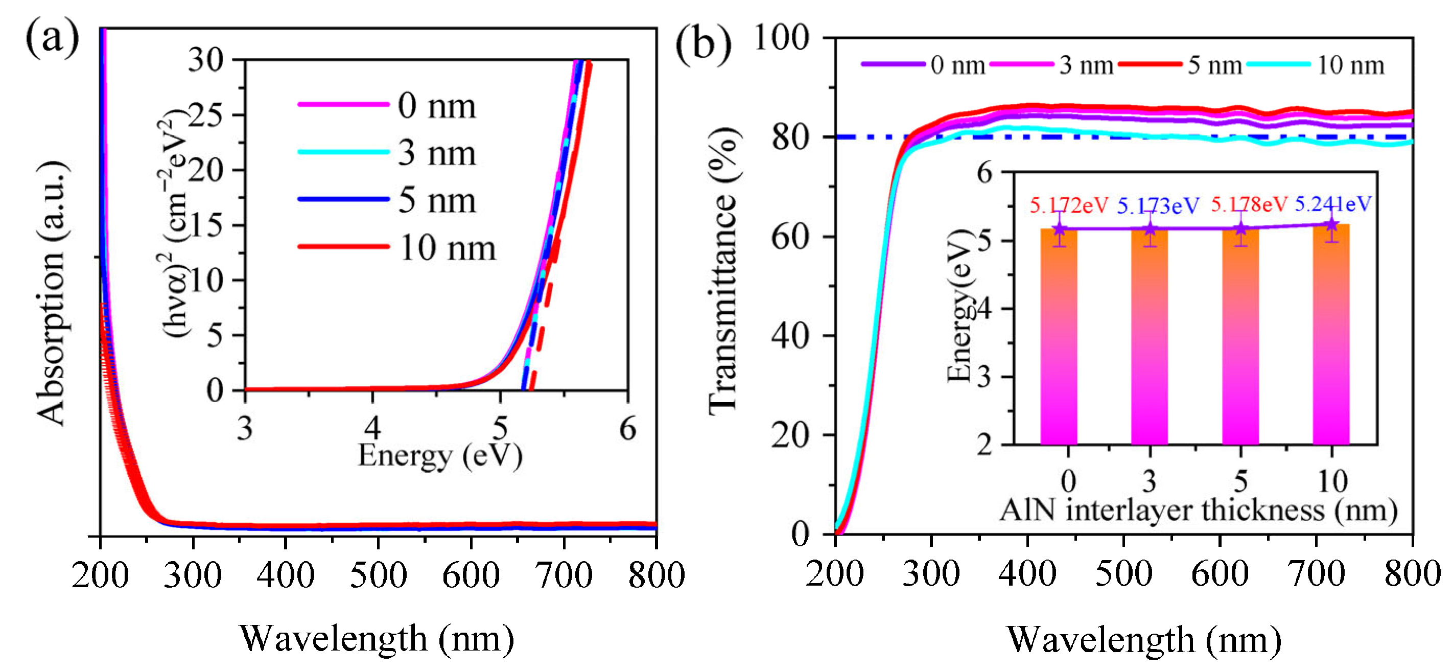 - Mg-doped β-Ga2O3 films with AlN layers exhibit strong UV absorption in the 200–300 nm solar-blind region. A thinner AlN layer has little effect on the bandgap, whereas increasing the thickness to 10 nm causes a noticeable increase. The light transmittance for samples S0, S1, and S2 appears to be fairly high and increases with thickness, while for sample S3 the transmittance shows a decrease due to excessive thickness.
