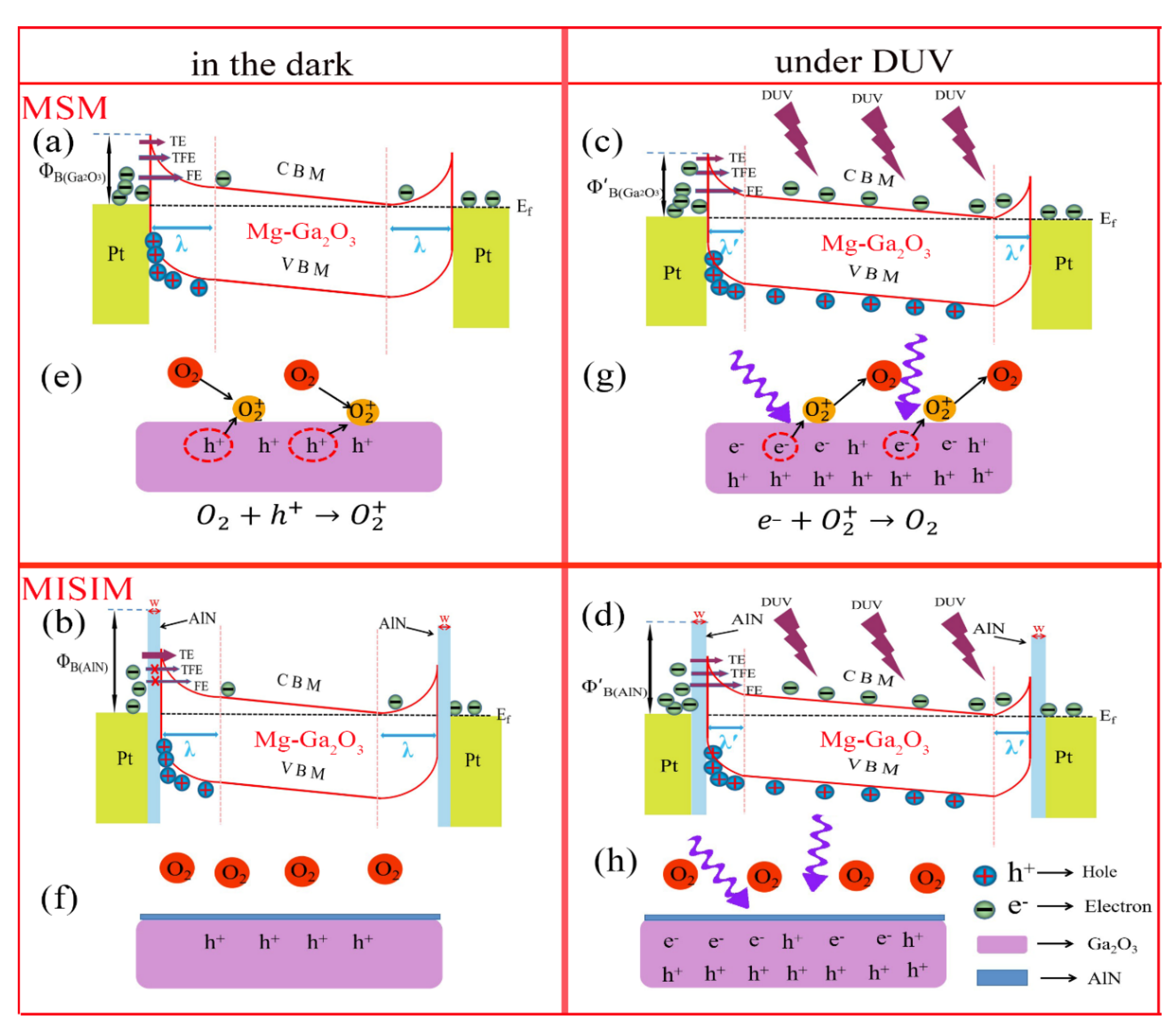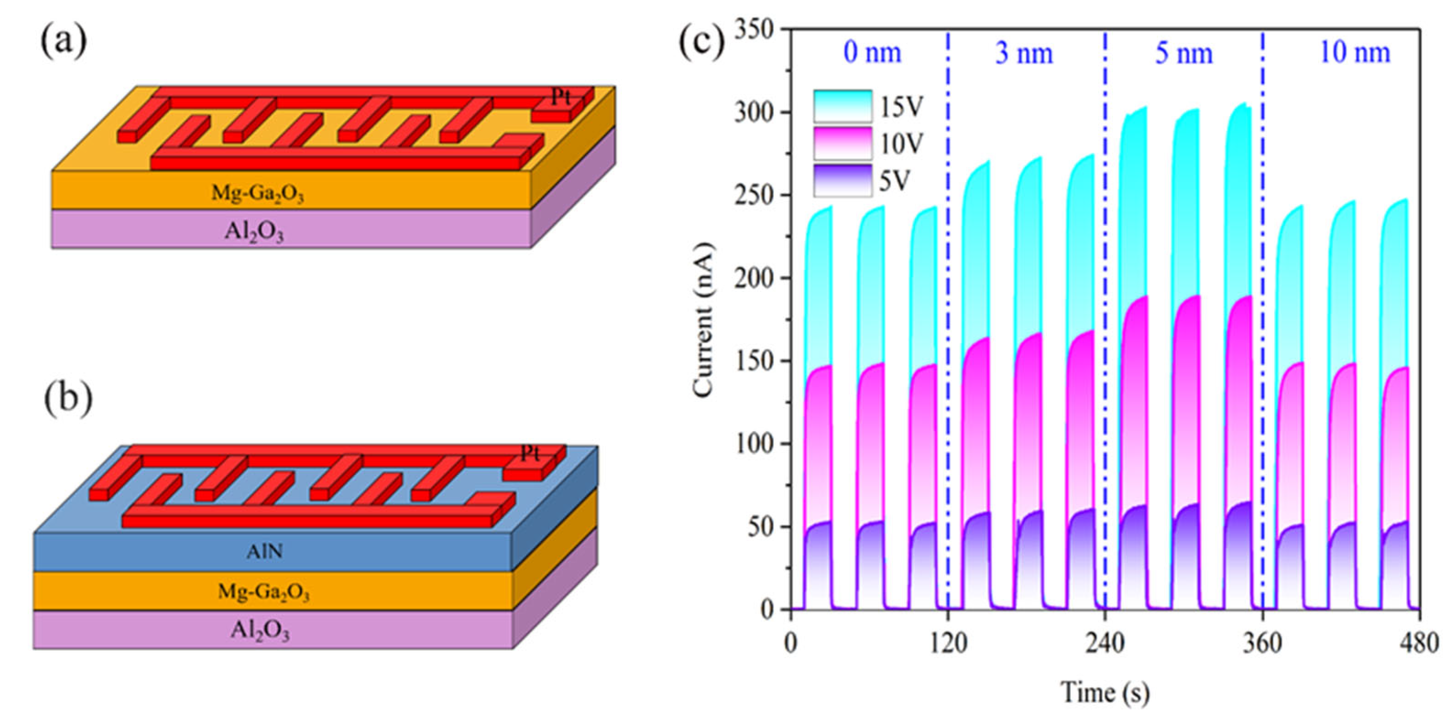 - The photocurrent increases with light intensity, and the presence of the AlN layer strengthens this linear relationship while reducing surface defect states, thereby improving photocarrier dynamics. The AlN layer inhibits the adsorption and desorption processes between the photogenerated electron–hole pair and O2, thereby retaining more photogenerated non-equilibrium carriers, which is also helpful in enhancing the photoelectric detection performance.
