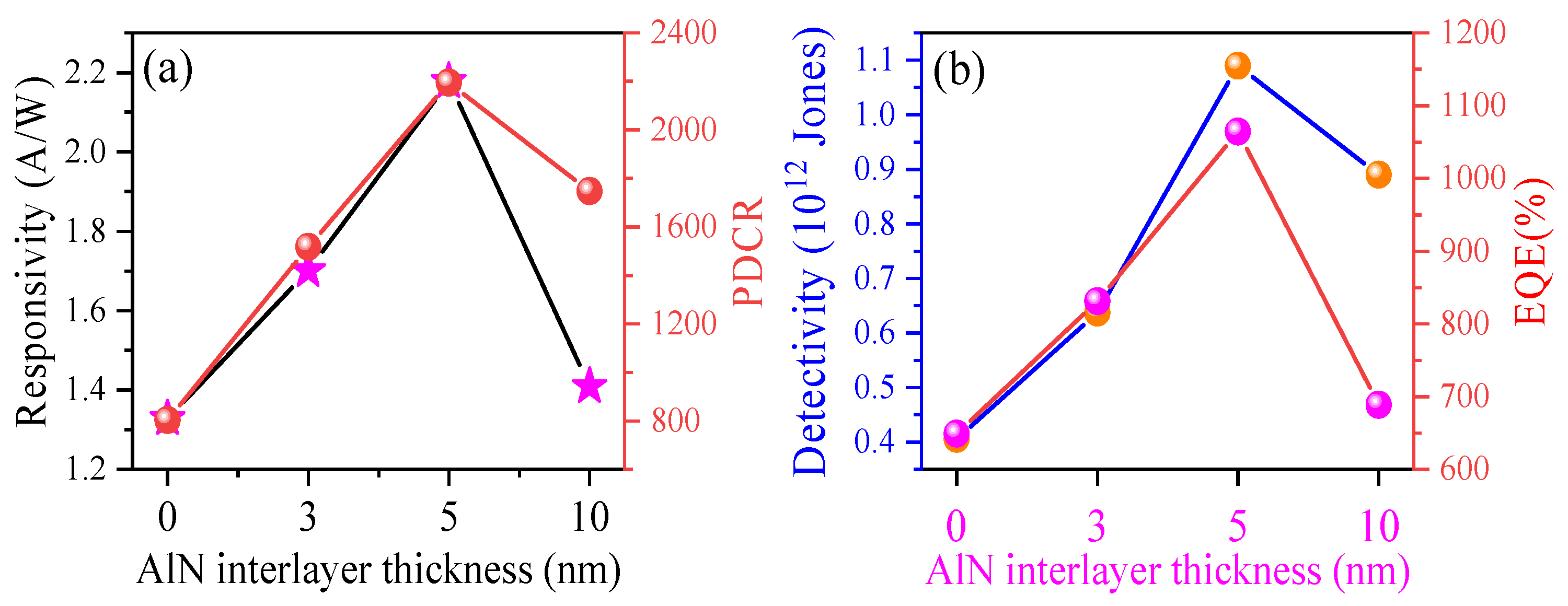 - The dark current of MISIM photodetectors is relatively less affected by bias voltage. At 10 V voltage, with the increase in AlN thickness, the photocurrent first increases and then decreases, and the dark current gradually decreases. The thickness of the AlN passivation layer also has a significant impact on the response characteristics of the detector, and the response characteristics of the device are best when the AlN passivation layer is 5 nm. The AlN passivation layer enhances the photoconductive gain of the detector, which is attributed to its modulation of interface state density, carrier transport, and the internal electric field.