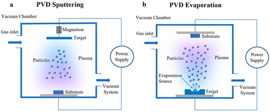 As illustrated in Figure 2, the operational principle of Physical Vapor Deposition (PVD) can be described in two primary methods. In magnetron sputtering (Figure 2a), the vacuum chamber is first evacuated, after which a process gas is introduced. A power supply then generates plasma, which is confined by magnetic fields, enabling energetic ions to bombard the target and dislodge atoms via sputtering. These ejected particles are subsequently transported to the substrate and deposited as a thin film. Alternatively, the evaporation method (Figure 2b) involves heating a target material within a vacuum using an evaporation source, causing atoms to evaporate and form a vapor. These vapor-phase particles are then transported to and deposited onto the substrate surface, resulting in the formation of a coherent coating. Both techniques operate under high vacuum conditions to maintain a contaminant-free environment and facilitate the transition of target material from solid to vapor phase, ultimately leading to film formation on the substrate [38].