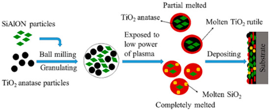 Wang et al. deposited the SiAlON ceramic coating on TiO2-316 stainless steel via atmospheric pressure plasma spray deposition. Figure 6 presents a schematic diagram of the underlying deposition mechanism [58].