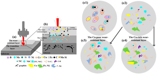 Schematic of the Friction and Wear Mechanism (a): Schematic of laser cladding multi-layer structure (b) Detail of element and phase distribution in cladding layer (cladding powder elements, element floating in traditional layer) (c1–c4) Schematic of microstructural evolution in wear-resistant layers with different Cu contents (phase composition changes in Cu-poor and Cu-rich layers) [66].