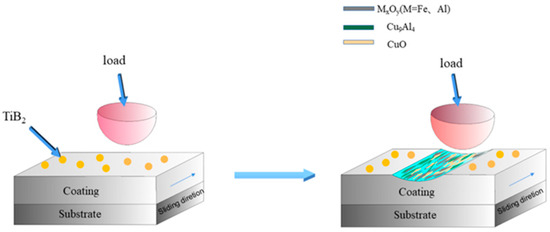 To advance the tribological performance of FeAl intermetallic compounds, Chi et al. [97] designed a novel FeAl-TiB2-Cux coating with graded copper contents. As depicted in Figure 10, its lubrication mechanism at 600 °C involves the in situ generation of multiple high-temperature synergistic lubricating phases through triggered chemical reactions during friction, thereby significantly enhancing the coating’s overall tribological properties in high-temperature environments.