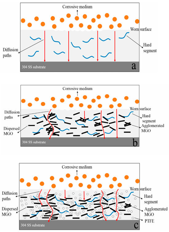 Corrosion resistance mechanisms of worn neat WPU coating (a), worn MGO/WPU composite coating (b), and worn MGO-PTFE/WPU composite coating (c) [106].
