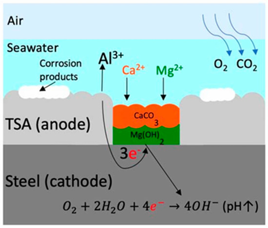 Sacrificial coatings protect the underlying steel by functioning as a preferential anode in the electrochemical cell. These coatings, typically made of zinc or aluminum, corrode in place of the steel, thereby cathodically protecting the substrate. As shown in Figure 13, when steel is subjected to cathodic protection (CP), an alkaline environment is created, leading to the accumulation of calcareous matter on the surface, thereby reducing the requirement for cathodic protection [109].