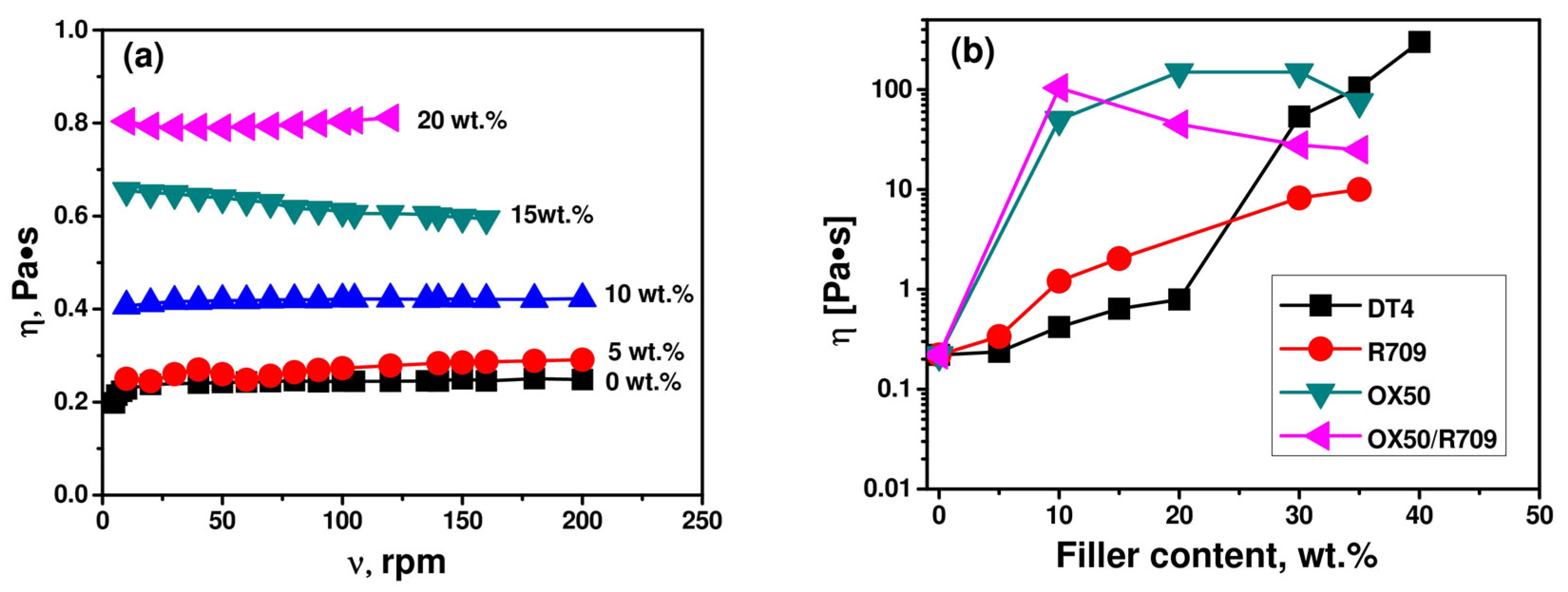 Composites containing DT4 exhibit more gradual viscosity growth. Although DT4 has the highest specific surface area (~160 m2/g) and the smallest particle size (~12 nm), its hydrophobic surface treatment reduces agglomeration and hydrogen bonding, allowing better dispersion and delaying the onset of a sharp increase in viscosity until higher filler loadings (>30 wt.%).