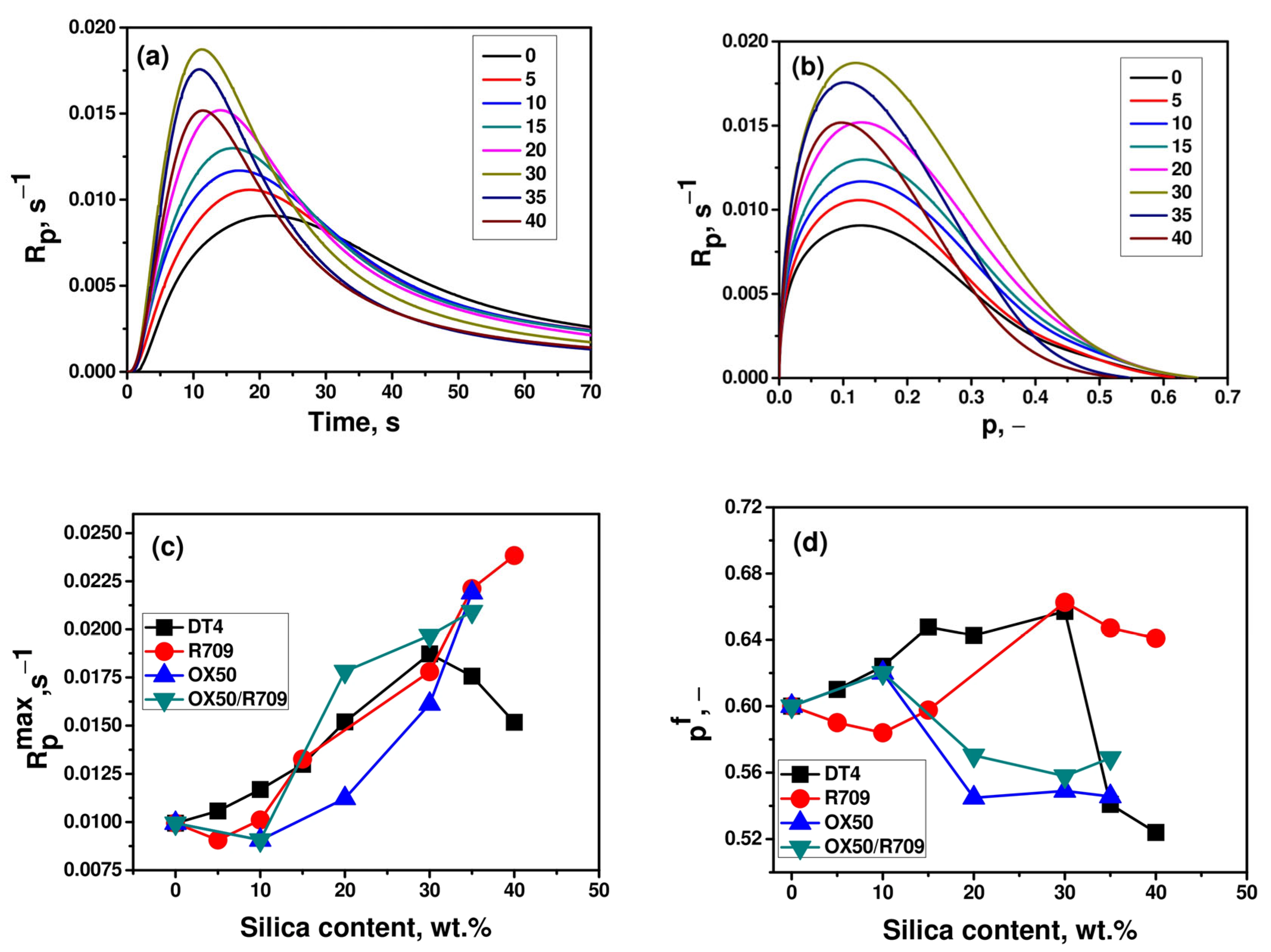 Figure 2. Representative dependencies of the polymerisation rate (Rp) on: (a) time (t); (b) degree of double bond conversion (p) for the Bis-GMA/TEGDMA/DT4 system; (c) dependence of the maximum polymerisation rate (Rpmax) on the silica filler content in compositions containing silica types: DT4, R709, OX50, and OX50/R709 (the lines are guides to the eye); (d) final bond conversion (pf) for formulations at various filler content (in wt.%, the lines are guides to the eye). The numbers in the figure indicate the corresponding filler contents.