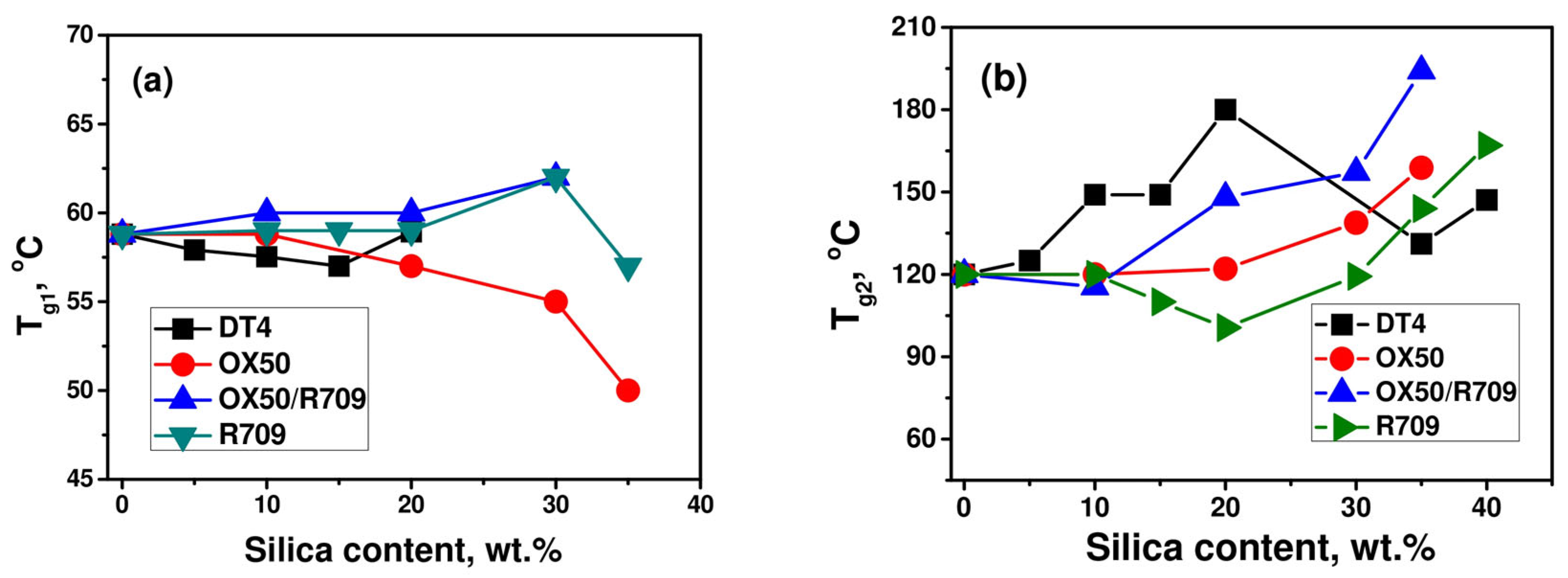 Figure 3. Dependencies of the glass transition temperature (Tg) on the silica filler content in composite containing silica types: DT4, R709, OX50, and OX50/R709:(a) Tg1; (b) Tg2. The lines are guides to the eye.