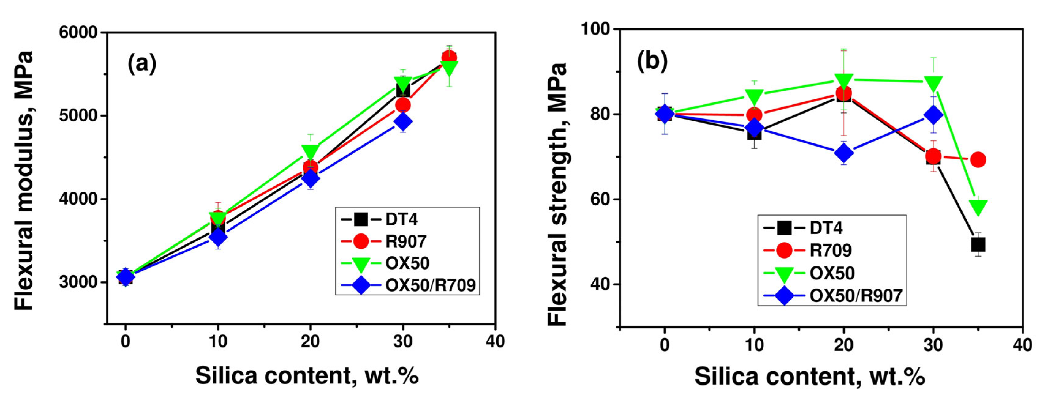 Figure 6. Dependence of the flexural modulus (a) and flexural strength (b) on the filler content for composites containing different types of silica: DT4, OX50, R709, and a 1:1 mixture of OX50 and R709. The lines are guides to the eye.