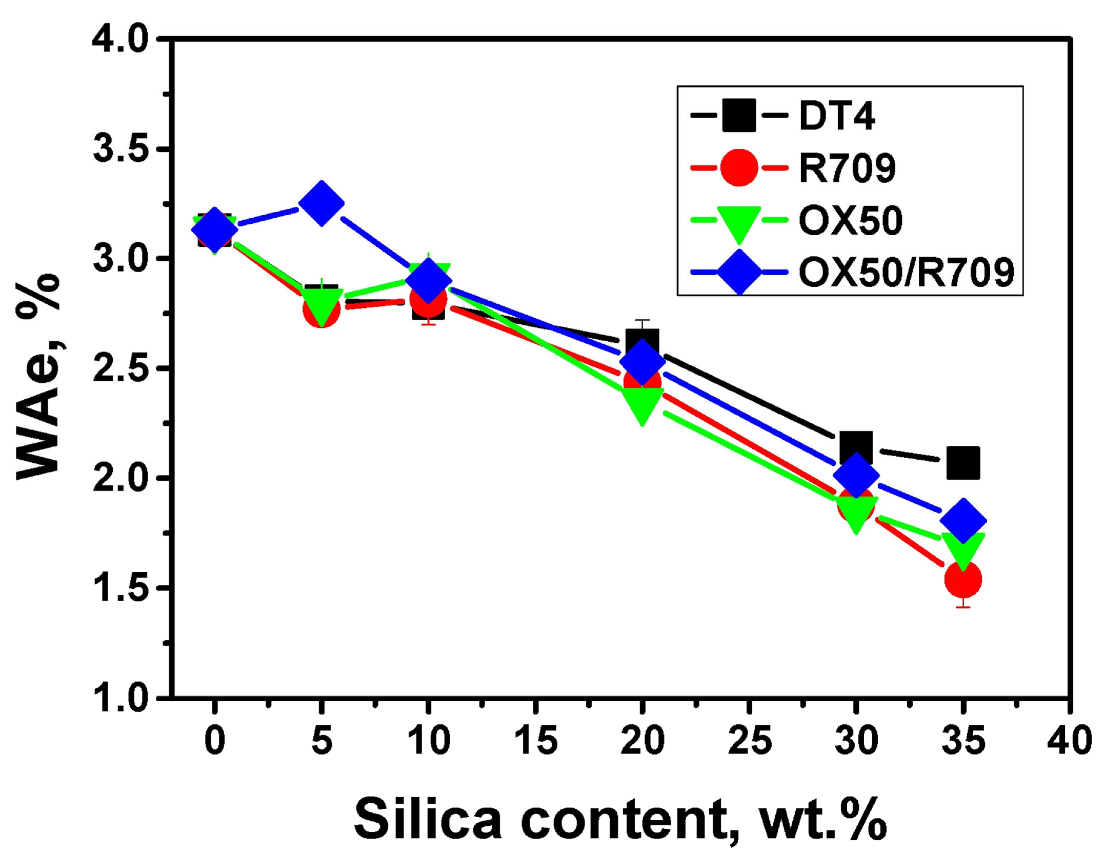Figure 7 presents the relationship between water sorption in equilibrium swelling and the filler content for composites containing different types of silicas. Increasing the filler content resulted in a progressive decrease in water sorption, regardless of the filler type. For the unfilled system, the water uptake was approximately 3.2 wt.%, which is consistent with the known hydrophilic character of the Bis-GMA/TEGDMA resin matrix.