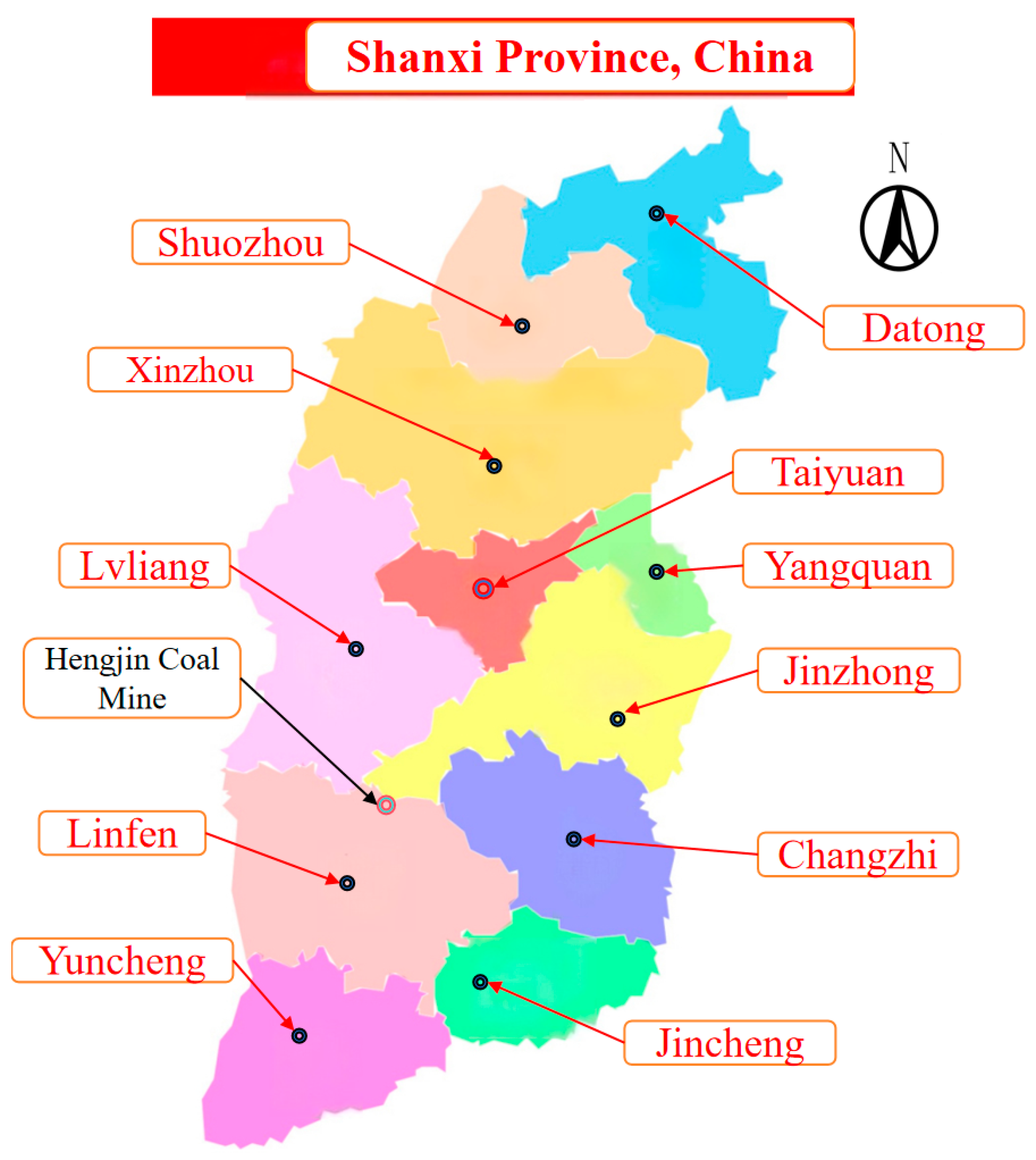 Figure 1. Map of Shanxi province. (Hengjin Coal Mine is our research subject and is indicated in black font in the figure).